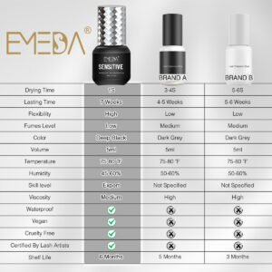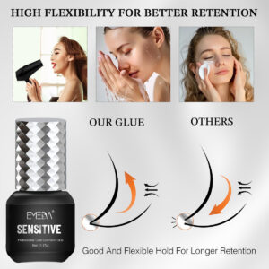 Cola de extensão de cílios sensível EMEDA 0,17 fl.oz/5 ml/1 seg. Tempo de seca/retenção de 5 a 7 semanas/adesivo preto/suprimentos profissionais de cola hipoalergênica para extensão de cílios sem formaldeído – Aviso! Permita SOMENTE o uso do SALON. Qualquer uso pessoal para fins sem extensão dos cílios pode causar queimaduras graves nos olhos, picadas e cuidado em pessoas sensíveis. – 1 segundo de tempo de secagem super rápido. Projetada para artistas profissionais de cílios, esta cola para extensões de cílios seca em 1 segundo para ajudar os técnicos a trabalhar com eficiência. – Sem látex e formaldeído. Materiais seguros e de alta qualidade produzem pouca fumaça, tornando seus clientes menos expostos a ingredientes químicos e irritações na pele. – Resistência duradoura e à prova d'água. A cola forte para extensão de cílios mantém os cílios por 7 a 8 semanas, ajudando os clientes a manter suas extensões por mais tempo e mantendo uma boa reputação no salão de beleza! – Nova cola macia flexível. Esta cola para extensão de cílios é mais suave para peles sensíveis para aliviar o desconforto dos clientes. Fácil de moldar após a secagem, com menos resíduos para melhor remoção, o que é mais fácil para os artistas de cílios manusearem.
