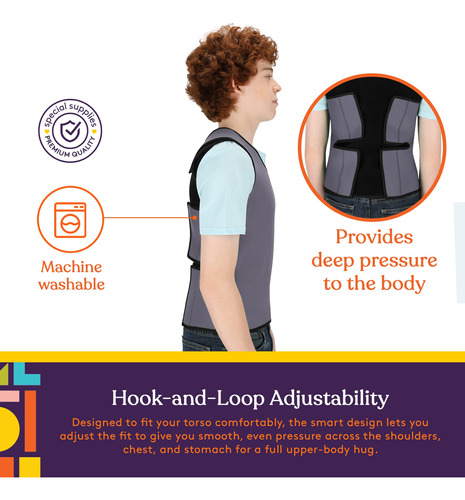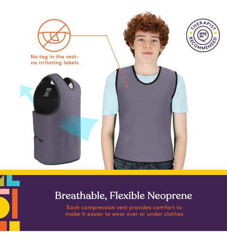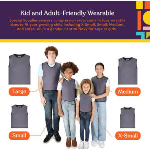 Suprimentos especiais para crianças de todos os tamanhos: os coletes de compressão sensorial vêm em cinco tamanhos versáteis para seu filho em crescimento, incluindo GG, pequeno, médio e grande; tudo em um estilo azul marinho neutro para meninos ou meninas. Uso em casa, em viagens e na sala de aula. Nosso colete sensorial versátil pode ser usado onde e quando seu filho precisar se acalmar ou se sentir mais no controle, inclusive em longas viagens de carro, na sala de aula com amigos ou professores ou quando seu filho precisar se acalmar ou se sentir mais no controle, inclusive em longas viagens de carro, na sala de aula com amigos ou professores ou quando seu filho precisar se acalmar ou se sentir mais no controle. Macias, respiráveis e solidárias. Projetadas para se enrolar confortavelmente sobre os ombros e ao redor da barriga O colete para crianças permite que elas se movam, brinquem e vivenciem a vida com mobilidade natural, enquanto se mantêm frescas e relaxadas em qualquer lugar. Suprimentos especiais para crianças de todos os tamanhos. Os coletes de compressão sensorial vêm em cinco tamanhos versáteis para crianças em crescimento, incluindo GG, pequeno, médio e grande; tudo em um estilo azul marinho neutro para meninos ou meninas