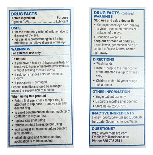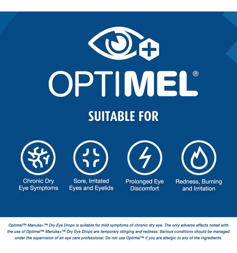 O colírio seco Optimel Manuka+ contém um Leptospermum spp patenteado de grau farmacêutico. (Manuka) mel (165 mg/g) combinado com 0,2% de glicerina. O produto é adequado para sintomas de olho seco crônico, desconforto ocular e olhos e pálpebras doloridos e irritados. O colírio seco Optimel Manuka+ deve ser usado em conjunto com uma boa higiene das pálpebras. Condições graves ou agravantes devem ser tratadas sob a supervisão de um oftalmologista.