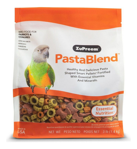 ZuPreem Nutrição essencial diária para papagaios e conures. O PastaBlend, com formatos de massa e cores naturais, adiciona variedade ao programa de alimentação diária das aves. Inclui vitaminas e minerais que os pássaros precisam todos os dias. Adequado para cinzas africanas, cacatuas, amazonas, senegais e outros papagaios e conures que preferem esse tamanho de pastilha. Nutrição diária premium. Feito nos Brasil. Natural Colors Pasta Shapes Adiciona variedade enquanto mantém a nutrição diária premium Instruções de alimentação: Alimente com base nas quantidades diárias recomendadas indicadas abaixo. Ajuste as quantidades para garantir a condição corporal ideal de suas aves. Alimente diariamente para fornecer a base da dieta de seus pássaros. Mantenha alimentos frescos e água disponíveis em todos os momentos. Descarte os alimentos não consumidos antes de cada mamada. Como acontece com todos os alimentos, lave as mãos após o uso e as tigelas de comida e água antes de cada mamada. Conures, Caiques 1/4 1/2 xícara por dia, African Greys, Senegals, Amazonas, Eclectus, Cacatuas pequenas 1/2 xícara por dia Ingredientes: milho moído, farelo de soja, trigo moído, farinha de germe de trigo, açúcar, óleo vegetal (preservado com mistura de tocoferóis), fosfato dicálcico, carbonato de cálcio, sal iodado, DL-metionina, cloreto de colina, vitaminas (Suplemento E, suplemento de niacina, pantotenato de D-cálcio, suplemento de riboflavina, cloridrato de piridoxina, mononitrato de tiamina, acetato de vitamina A, suplemento de vitamina D3, complexo de bissulfito de sódio de menadiona (fonte de vitamina K atividade), suplemento de vitamina B12, ácido fólico, biotina), monocloridrato de L-lisina, tocoferóis mistos (conservantes), suco de vegetais (cor), páprica (cor), carmim (cor), L-ascrobil-2-polifosfato, minerais (óxido manganoso, óxido de zinco, sulfato de cobre, iodato de cálcio, selenito de sódio), extrato de urucum (cor), Análise garantida do extrato de alecrim: Proteína bruta, min 14,0%; Gordura bruta, min 4,0%; Fibra bruta, máx 4,0%; Umidade, máx. 10%; Lisina, min 0,8%; Metionina, min 0,4%; Fósforo, min 0,4%; Potássio, min 0,5%; Vitamina D, min 500 UI/kg (225 UI/lb); Vitamina E, mínimo 60 UI/kg (25 UI/lb)