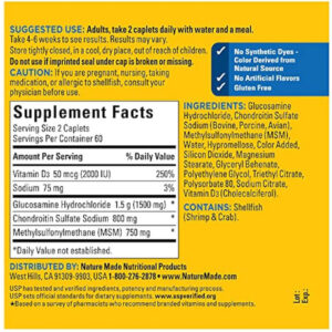 Suplemento de suporte articular: contém um frasco de 120 contagens de Complexo de Glucosamina e Condroitina Nature Made com cápsulas de MSM para um suprimento de 60 dias