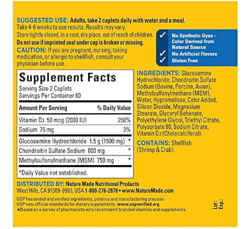Complexo de glucosamina e condroitina Nature Made com MSM, suplemento dietético para suporte articular, 120 comprimidos, suprimento para 60 dias