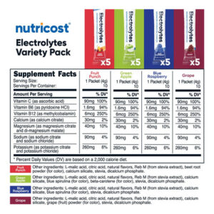 Mantenha-se revigorado e hidratado com os Stickpacks Nutricost Electrolyte! Cada bolsa contém 40 pacotes de adesivos individuais projetados para conveniência e portabilidade. Nossos stickpacks contêm 7 vitaminas e minerais para atender às suas necessidades. Com zero açúcar e adoçados naturalmente com estévia, os pacotes de eletrólitos Nutricost oferecem uma maneira livre de culpa de reabastecer seus eletrólitos. – Sabor do pacote variado: desfrute de uma variedade de sabores, incluindo: maçã verde, ponche de frutas, framboesa azul e uva. – Zero açúcar: uma opção sem açúcar para reposição de eletrólitos. – Adoçado naturalmente com estévia: esses pacotes de eletrólitos são adoçados com extrato de estévia, proporcionando um sabor agradável sem adoçantes artificiais. – 40 porções individuais: inclui 40 pacotes de palitos pré-medidos para uso prático e prático em qualquer lugar hidratação a qualquer hora, em qualquer lugar. – Certificado GMP e testado por terceiros: Produzido em uma instalação com certificação GMP e testado de forma independente para garantir ingredientes de alta qualidade e segurança.