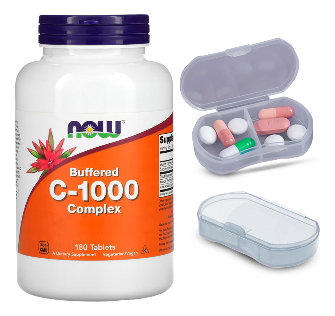 Kit Complexo Vitamina C 1000mg Now Foods 180Tabs + Porta Cápsulas Suporte Nutricional Avançado: Este Complexo de Vitamina C de 1000mg oferece um suporte nutricional avançado. Cada tablete é formulado para fornecer uma dose robusta de Vitamina C, essencial para várias funções no corpo. Tabletes de Fácil Consumo: Os tabletes são projetados para serem fáceis de engolir, proporcionando uma forma conveniente de incluir Vitamina C em sua rotina diária. Sua formulação sólida é uma alternativa prática para quem prefere não usar cápsulas ou pós. Produto Importado de Pronta Entrega: Este suplemento é importado, assegurando alta qualidade e padrões de fabricação internacionais. Com a vantagem da pronta entrega, você pode começar a utilizá-lo rapidamente. Porta Cápsulas com Duas Repartições: O kit também inclui um porta-cápsulas prático, dividido em duas seções internas. Isso permite uma organização eficaz e separada de diferentes tipos de cápsulas ou pílulas. Composição de Alta Qualidade: Cada tablete contém 1000mg de Vitamina C, além de outros ingredientes auxiliares para garantir a máxima eficácia do produto. Livre de componentes artificiais, oferece um suplemento puro e eficiente. VALIDADE LONGA