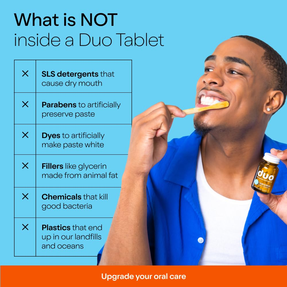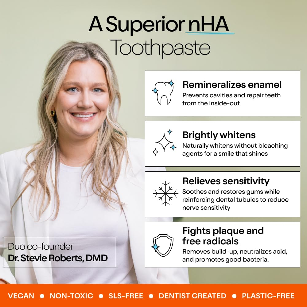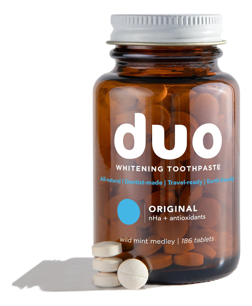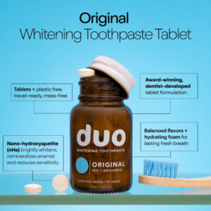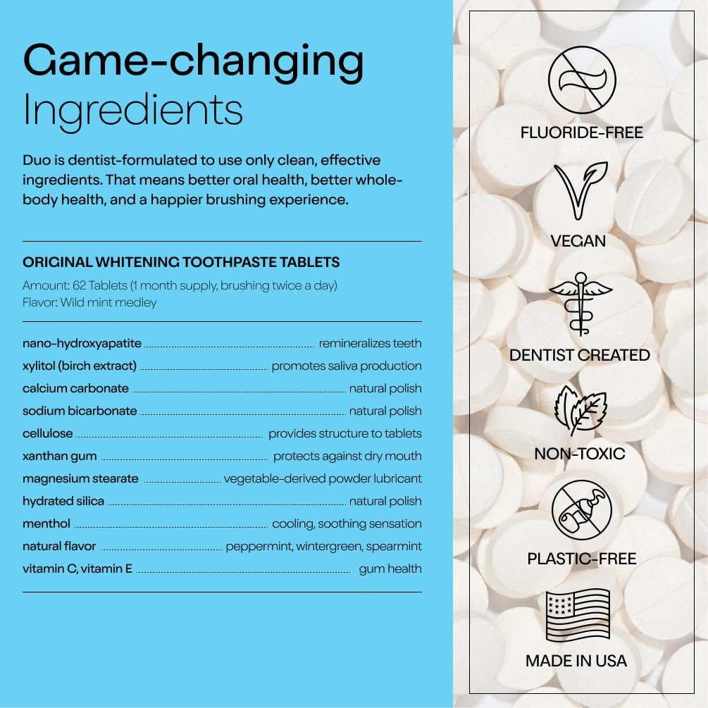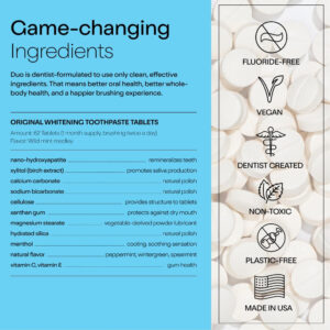 Comprimidos de creme dental Duo | Branqueador natural de nano-hidroxiapatita (NHa), remineraliza e reduz a sensibilidade | Sustentável e sem plástico | Criado por dentistas | Wild Mint Medley – 1 frasco/186 comprimidos – COMPRIMIDOS DE CREME DENTAL BRANQUEADOR SUPERIOR – Descubra a alegria de um sorriso radiante de forma natural. Enriquecida com a potente nano-hidroxiapatita (nHA), uma alternativa naturalmente remineralizante ao flúor, nossa mistura exclusiva remineraliza seus dentes e alivia a sensibilidade. Nossa lista de ingredientes elaborada por dentistas inclui vitaminas C e E essenciais e extratos botânicos calmantes para equilibrar seu ambiente bucal. Abrigada em um frasco sustentável e sem plástico, esta é a solução definitiva para a saúde bucal consciente. – NHA + ANTIOXIDANTES – A combinação potente de nano-hidroxiapatita e vitaminas oferece benefícios imbatíveis para sua saúde bucal. A nano-hidroxiapatita substitui o flúor, auxilia na remineralização e melhora significativamente o esmalte dentário. As vitaminas C e E atuam como antioxidantes robustos que vitalizam os tecidos orais e combatem os radicais livres nocivos. Antioxidantes e espuma hidratante criam um microbioma oral equilibrado que é vital para sua saúde. – ILUMINA, COMBATE A PLACA BACTERIANA E ALIVIA A SENSIBILIDADE – Libera os imensos benefícios de nosso creme dental clareador natural que ilumina os dentes com eficácia, combate o acúmulo de placa bacteriana e fornece alívio calmante para a sensibilidade. Sua fórmula meticulosamente elaborada combate e impede a placa bacteriana prolongada, ajudando a manter gengivas e dentes saudáveis. Nossa fórmula supera sinergicamente os problemas de sensibilidade dentária, promovendo um ambiente enriquecedor para sua saúde bucal e apoiando um sorriso saudável! – CUIDADO BUCAL PREMIUM FORMULADO POR DENTISTAS – Criada por profissionais da odontologia, nossa fórmula garante uma higiene bucal ideal. Usando ingredientes de qualidade alimentar, nossa espuma hidratante cria um microbioma equilibrado e contribui para a saúde geral do seu microbioma oral. Este creme dental superior foi projetado para promover um ambiente bucal equilibrado e contribuir para a saúde bucal geral, todos os dias. – POR QUE COMPRIMIDOS DE PASTA DE DENTE? – Aproveite a estética da inovação com nossos comprimidos de creme dental para um regime de higiene bucal otimizado. Os comprimidos de creme dental não são apenas convenientes, mas também uma escolha ambientalmente consciente. Eles são projetados para minimizar o desperdício e aumentar a conveniência. Sua portabilidade os torna uma opção ideal para viagens e sem bagunça. Revolucione sua experiência de atendimento odontológico com nossos comprimidos de creme dental sustentáveis, sem plástico e de última geração.