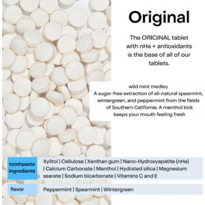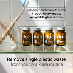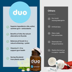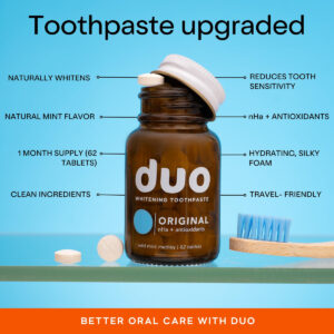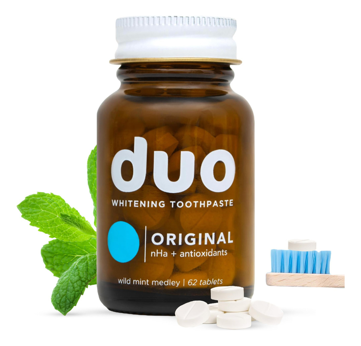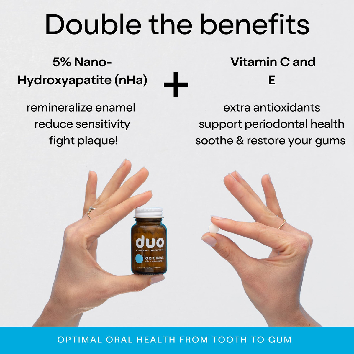 Revitalize seu sorriso com os comprimidos pioneiros da Duo Descubra o poder transformador do clareamento natural com os comprimidos de pasta de dente Duo. Cada comprimido é infundido com nano-hidroxiapatita, uma alternativa ao flúor que fortalece o esmalte e restaura a perda mineral. Combinando as vitaminas C e E, a formulação do Duo nutre o tecido oral para um sorriso robusto e saudável. Com cada pincel, você abraçará o brilho que merece e, ao mesmo tempo, contribuirá para um planeta mais verde por meio de nossas embalagens sustentáveis. Embrace uma experiência holística de saúde bucal Os comprimidos de creme dental Duo oferecem mais do que apenas uma promessa de clareamento; eles são uma prova de um cuidado bucal abrangente. A mistura inovadora que aproveita extratos botânicos equilibra ativamente seu ambiente bucal, promovendo um espaço favorável à flora para seus dentes e gengivas. Experimente a sinergia da ciência dentária avançada e da sabedoria da natureza com cada comprimido, atenuando a sensibilidade e melhorando seu conforto bucal. Cuidado inovador para estilos de vida modernos Entre no futuro da higiene dental com os convenientes comprimidos de creme dental Duo. Projetada por profissionais da odontologia, nossa fórmula exclusiva cria uma espuma hidratante de qualidade alimentar que não apenas combate a placa, mas também mantém um microbioma oral florescente. O cuidado premium que você valoriza agora está disponível em um tablet de última geração, oferecendo uma combinação incomparável de eficácia e facilidade para sua vida dinâmica. -Clareamento natural com nHA -Remineralização sem flúor -Fórmula enriquecida com vitaminas -, embalagem sustentável – Comprimidos calmantes Pro-Dental – COMPRIMIDOS DE CREME DENTAL BRANQUEADOR SUPERIOR – Descubra a alegria de um sorriso radiante de forma natural. Enriquecida com a potente nano-hidroxiapatita (nHA), uma alternativa naturalmente remineralizante ao flúor, nossa mistura exclusiva remineraliza seus dentes e alivia a sensibilidade. Nossa lista de ingredientes elaborada por dentistas inclui vitaminas C e E essenciais e extratos botânicos calmantes para equilibrar seu ambiente bucal. Abrigada em um frasco sustentável e sem plástico, esta é a solução definitiva para a saúde bucal consciente. – NHA + ANTIOXIDANTES – A combinação potente de nano-hidroxiapatita e vitaminas oferece benefícios imbatíveis para sua saúde bucal. A nano-hidroxiapatita substitui o flúor, auxilia na remineralização e melhora significativamente o esmalte dentário. As vitaminas C e E atuam como antioxidantes robustos que vitalizam os tecidos orais e combatem os radicais livres nocivos. Antioxidantes e espuma hidratante criam um microbioma oral equilibrado que é vital para sua saúde. – ILUMINA, COMBATE A PLACA BACTERIANA E ALIVIA A SENSIBILIDADE – Libera os imensos benefícios de nosso creme dental clareador natural que ilumina os dentes com eficácia, combate o acúmulo de placa bacteriana e fornece alívio calmante para a sensibilidade. Sua fórmula meticulosamente elaborada combate e impede a placa bacteriana prolongada, ajudando a manter gengivas e dentes saudáveis. Nossa fórmula supera sinergicamente os problemas de sensibilidade dentária, promovendo um ambiente enriquecedor para sua saúde bucal e apoiando um sorriso saudável! – CUIDADO BUCAL PREMIUM FORMULADO POR DENTISTAS – Criada por profissionais da odontologia, nossa fórmula garante uma higiene bucal ideal. Usando ingredientes de qualidade alimentar, nossa espuma hidratante cria um microbioma equilibrado e contribui para a saúde geral do seu microbioma oral. Este creme dental superior foi projetado para promover um ambiente bucal equilibrado e contribuir para a saúde bucal geral, todos os dias. – POR QUE COMPRIMIDOS DE PASTA DE DENTE? – Aproveite a estética da inovação com nossos comprimidos de creme dental para um regime de higiene bucal otimizado. Os comprimidos de creme dental não são apenas convenientes, mas também uma escolha ambientalmente consciente. Eles são projetados para minimizar o desperdício e aumentar a conveniência. Sua portabilidade os torna uma opção ideal para viagens e sem bagunça. Revolucione sua experiência de atendimento odontológico com nossos comprimidos de creme dental sustentáveis, sem plástico e de última geração.