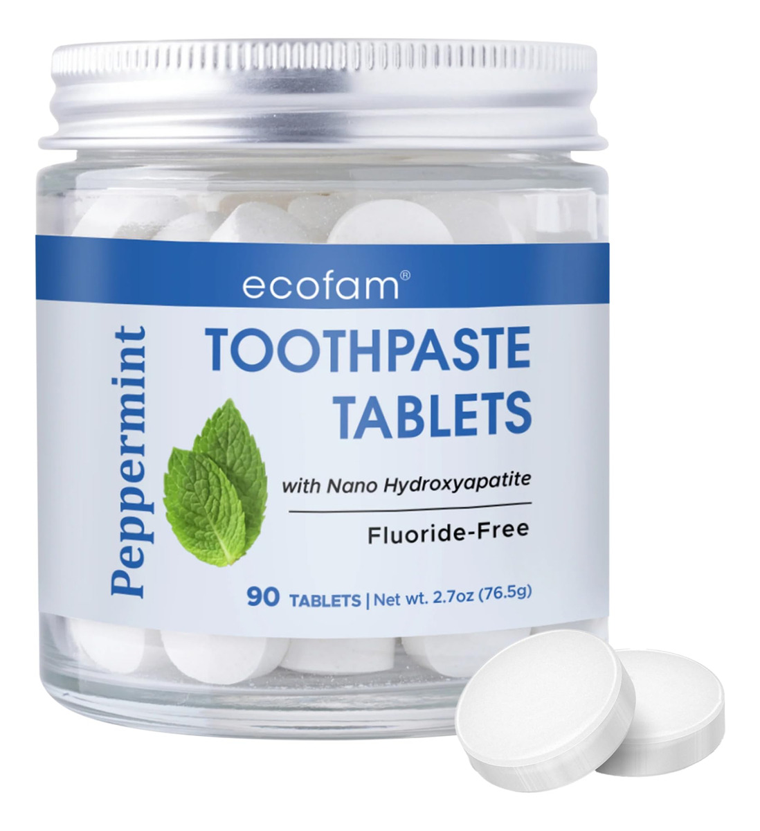 Apresentando os comprimidos de creme dental mastigável Ecofam — cuidados bucais limpos e ecológicos para toda a família! O creme dental EcoFam apresenta um design mastigável e sem água que permite escovar os dentes em qualquer lugar, a qualquer hora, sem carregar tubos volumosos de pasta de dente. Cada frasco contém 90 comprimidos de creme dental de tamanho generoso, feitos com ingredientes limpos. Perfeitamente distribuídos para uso em qualquer lugar, esses comprimidos de pasta de dente de viagem economizam espaço em sua bagagem, garantindo uma escovação sem bagunça onde quer que suas aventuras o levem. Por que escolher nossos comprimidos de creme dental? Nossos comprimidos de creme dental remineralizante são feitos com nano hidroxiapatita, uma forma natural de cálcio que remineraliza e restaura os dentes e o esmalte. Este ingrediente também funciona para diminuir a sensibilidade dos dentes, fazendo com que os dentes pareçam naturalmente mais brilhantes. Benefícios adicionais: Feito com argila de bentonita de cálcio para ajudar a clarear os dentes naturalmente Feito com sabores naturais para refrescar o hálito Não contém sabores ou cores artificiais Comprimidos de creme dental sem flúor Sem peróxido Escova sem sulfato SLS sem bagunça Design compacto e ideal para viagens Sabores disponíveis: baunilha, hortelã, morango, kiwi, chiclete, canela e gaultéria. Embalagem com desperdício zero: nossos tablets são embalados em frascos de vidro reutilizáveis, eliminando a necessidade de plásticos descartáveis. Instruções de uso: Coloque um comprimido na boca e esmague-o com os dentes. Molhe a escova de dentes e escove os dentes por cerca de 2 minutos. A pasta vai espumar um pouco quando você começar a escovar. Enxágue bem e aproveite seu sorriso brilhante e saudável! – Embalagem sem desperdício: vem em uma jarra de vidro para reciclagem – Ingredientes naturais: comprimidos com sabor de hortelã com argila bentonita e celulose – Sem flúor: não contém substâncias químicas nocivas como flúor – Sem sulfato: não contém sulfatos que podem irritar a pele – Adequado para veganos: adequado para veganos e não contém produtos de origem animal