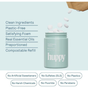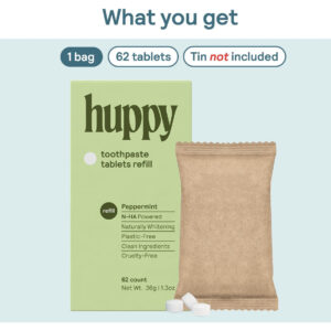 Creme dental Huppy – ILUMINE E BRANQUEE SEU SORRISO: os comprimidos de creme dental Huppy oferecem uma mistura de ingredientes limpos que iluminarão e branquearão seu sorriso. Ingredientes como N-HA para manter os dentes protegidos contra cáries, xilitol para afastar bactérias indesejáveis e óleo de coco para manter suas gengivas felizes e saudáveis. – COMPRIMIDOS DE CREME DENTAL DE NANO-HIDROXIAPATITA: Nossos comprimidos de creme dental incluem um ingrediente revolucionário chamado Nano-Hidroxiapatita (ou N-HA, para abreviar). Esta é uma alternativa ao flúor que fornece remineralização natural, proteção contra sensibilidade, prevenção de cáries e clareamento aprimorado para um sorriso bonito e brilhante. – COMO CREME DENTAL, MAS MELHOR: nossos comprimidos de creme dental são projetados para espumar como um creme dental comum. Ao contrário de outros comprimidos de pasta de dente que não se quebram facilmente, causando um sabor calcário ou quebradiço, nossos comprimidos são especialmente formulados para formar espuma, assim como um creme dental tradicional. – SUSTENTÁVEL E ECOLÓGICO: O creme dental tradicional é feito de uma combinação de plásticos que não são facilmente recicláveis, aumentando nossa pegada de carbono global. É por isso que os comprimidos de pasta de dente são a alternativa mais sustentável e ecológica. Nossos produtos vêm em embalagens sem plástico e todos os nossos ingredientes são fornecidos de forma sustentável e ética para sua tranquilidade. – TSA AND TRAVEL FRIENDLY: Nossa lata compacta e recarregável pode oferecer uma maneira fácil e amigável de viajar com todos os itens essenciais de higiene bucal.! Basta carregar sua lata, colocá-la na bolsa e pronto!