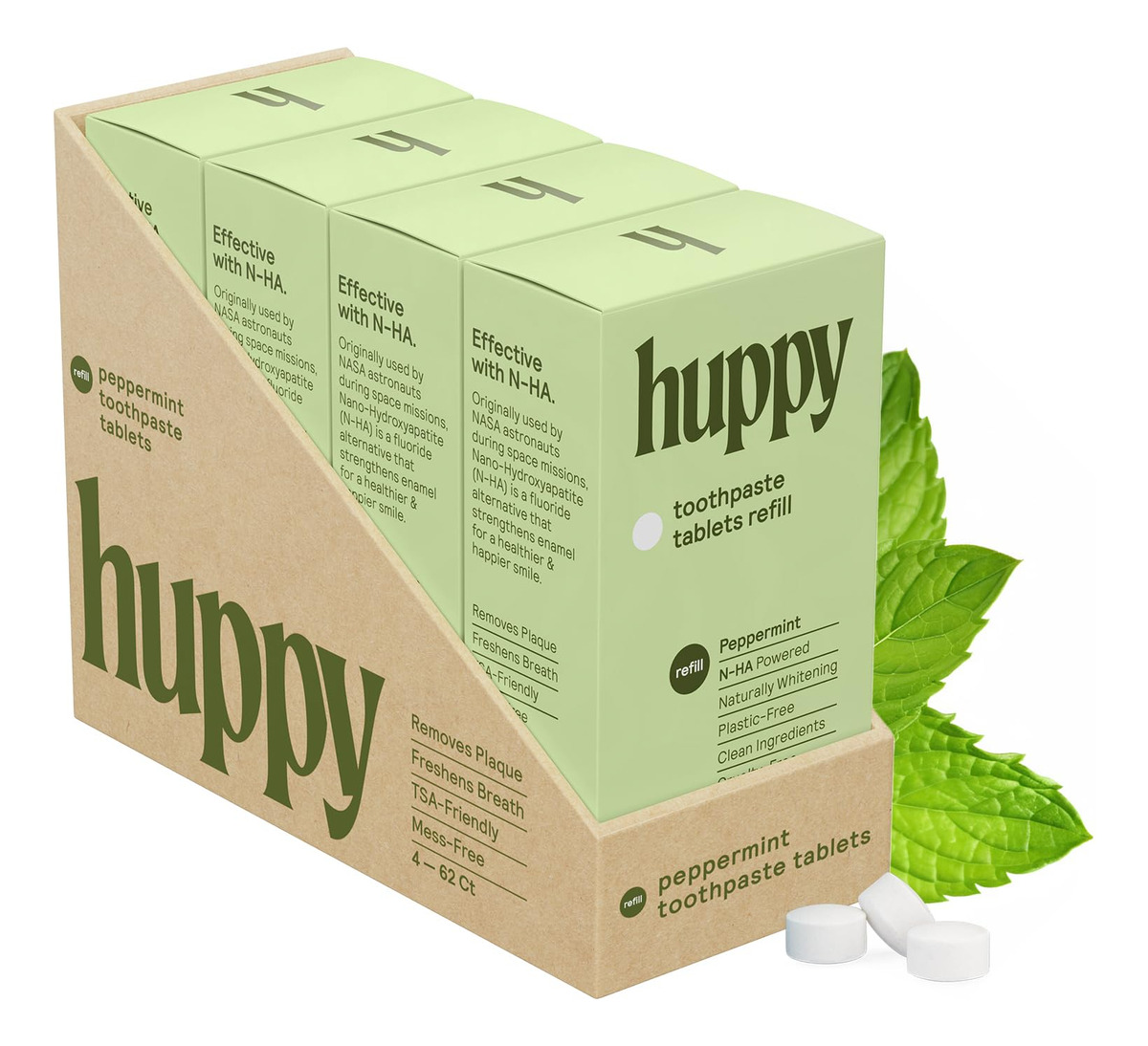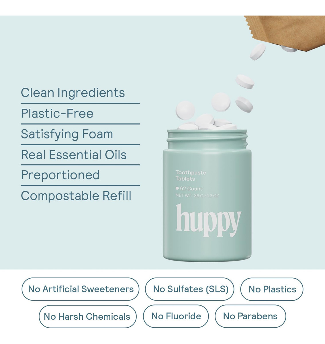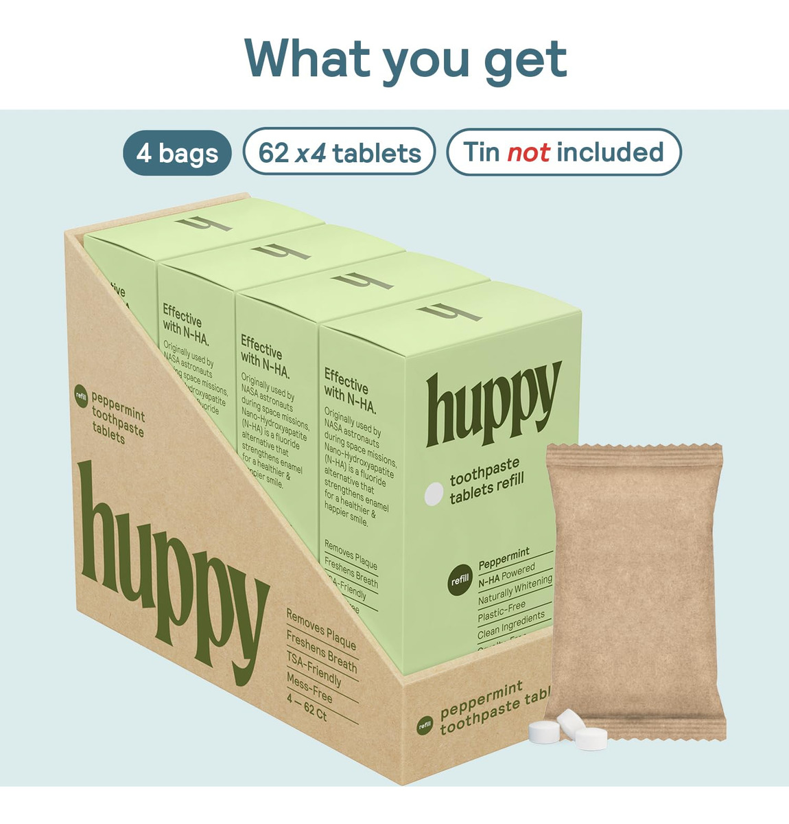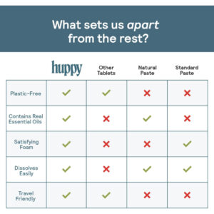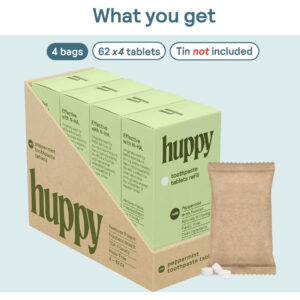 Creme dental Huppy – ILUMINE E BRANQUEE SEU SORRISO: os comprimidos de creme dental Huppy oferecem uma mistura de ingredientes limpos que iluminarão e branquearão seu sorriso. Ingredientes como N-HA para manter os dentes protegidos contra cáries, xilitol para afastar bactérias indesejáveis e óleo de coco para manter suas gengivas felizes e saudáveis. – COMPRIMIDOS DE PASTA DE DENTE NANO-HIDROXIAPATITA: Nossos comprimidos de creme dental incluem um ingrediente revolucionário chamado nano-hidroxiapatita (ou N-HA, para abreviar). Esta é uma alternativa ao flúor que fornece remineralização natural, proteção contra sensibilidade, prevenção de cáries e clareamento aprimorado para um sorriso bonito e brilhante. – COMO CREME DENTAL, MAS MELHOR: nossos comprimidos de creme dental são cuidadosamente projetados para formar espuma como um creme dental comum. Ao contrário de outros comprimidos de pasta de dente que não se quebram facilmente, causando um sabor calcário ou quebradiço, nossos comprimidos são especialmente formulados para formar espuma, assim como um creme dental tradicional. – SUSTENTÁVEL E ECOLÓGICO: os cremes dentais tradicionais são feitos de uma combinação de plásticos que não são facilmente recicláveis, aumentando nossa pegada de carbono global. É por isso que os comprimidos de pasta de dente são a alternativa mais sustentável e ecológica. Nossos produtos vêm em embalagens sem plástico e todos os nossos ingredientes são fornecidos de forma sustentável e ética para sua tranquilidade. – TSA AND TRAVEL FRIENDLY: Nossa lata compacta e recarregável oferece uma maneira fácil e amigável de viajar com todos os itens essenciais de higiene bucal! Basta carregar sua lata, colocar na bolsa e pronto!