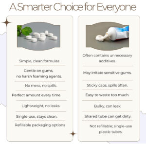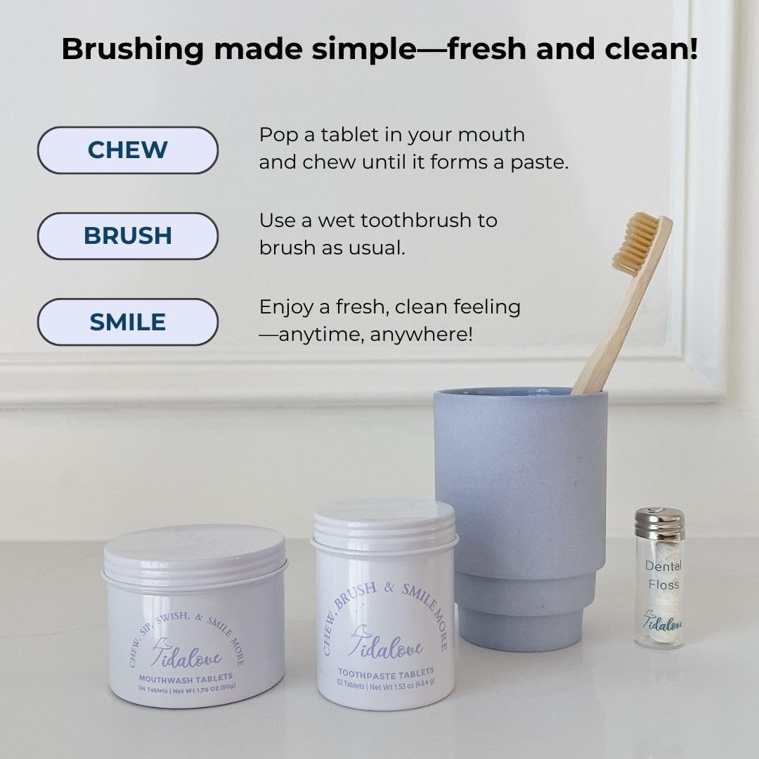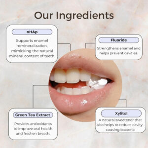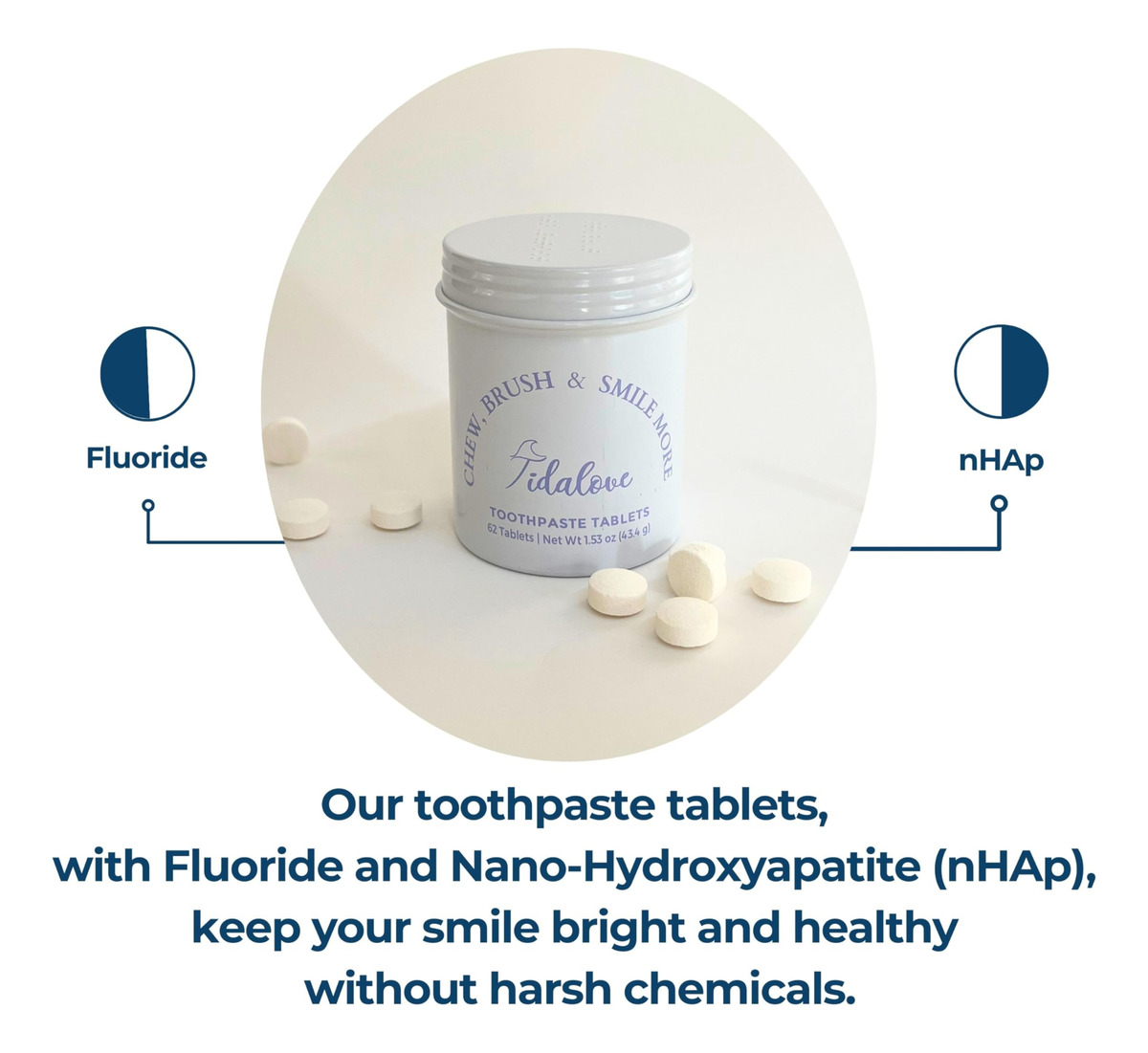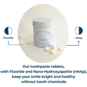 Refresque sua rotina de higiene bucal com o sabor fresco e revigorante do Cool Mint nos comprimidos de pasta de dente Smile More. Esses comprimidos são formulados habilmente com flúor e NHap (nano-hidroxiapatita) para proteger e fortalecer o esmalte, proporcionando uma limpeza poderosa e suave. Armazenados em uma lata elegante e reutilizável, esses comprimidos de pasta de dente são projetados para serem convenientes, esteja você em casa ou em trânsito. A fórmula vegana é isenta de SLS, corantes, triclosan, parabenos e adoçantes artificiais, garantindo uma experiência segura e relaxante para seus dentes e gengivas. O sabor Cool Mint oferece uma explosão de frescor que deixa seu hálito limpo e fresco, tornando cada sessão de escovação um deleite refrescante. Perfeitamente pré-distribuídos, esses comprimidos são ideais para viagens, garantindo que sua rotina de higiene bucal permaneça fácil e sem bagunça onde quer que a vida o leve. Escolha os comprimidos de creme dental Smile More com sabor Cool Mint para uma alternativa refrescante e sustentável à pasta de dente tradicional, ao mesmo tempo em que contribui para reduzir o desperdício de tubos de plástico. – FÓRMULA DE DUPLA AÇÃO PARA DENTES MAIS FORTES: esses comprimidos de creme dental combinam flúor e NHap (nano-hidroxiapatita) para maior proteção do esmalte. O flúor fortalece o esmalte, enquanto o nHap ajuda a reconstruí-lo e repará-lo, imitando a estrutura mineral natural dos dentes. – FÓRMULA VEGANA SUAVE: sem SLS, corantes, triclosan, parabenos e adoçantes artificiais, esses comprimidos de pasta de dente fornecem uma limpeza suave e eficaz, adequados para o uso diário. – TRÊS SABORES REFRESCANTES: Escolha entre Yuzu Minty Fresco, Canela Doce e Picante, ou o novo sabor Cool Mint para uma explosão de frescor que deixa seu hálito limpo e revigorado. – Comprimidos de pasta de dente convenientes em uma lata: embalados em um recipiente reutilizável e ecológico estanho amigável, esses comprimidos de pasta de dente são perfeitos para uso doméstico ou em viagens, mantendo sua rotina de higiene bucal simples e sem bagunça. – FÁCEIS DE VIAJAR E SEM BAGUNÇA: a embalagem compacta de lata facilita o transporte desses comprimidos de pasta de dente pré-distribuídos, garantindo que sua higiene bucal seja mantida onde quer que você vá. – CUIDADO BUCAL APRIMORADO: A combinação de flúor e nHap não só ajuda a prevenir cáries, mas também auxilia na remineralização natural dos dentes, promovendo um esmalte mais forte e saudável. – REDUZA O DESPERDÍCIO E PROTEJA O PLANETA: Ao optar pela pasta de dente Com comprimidos em uma lata reutilizável, você está contribuindo para a redução do desperdício dos tubos tradicionais de pasta de dente, causando um impacto positivo no meio ambiente.