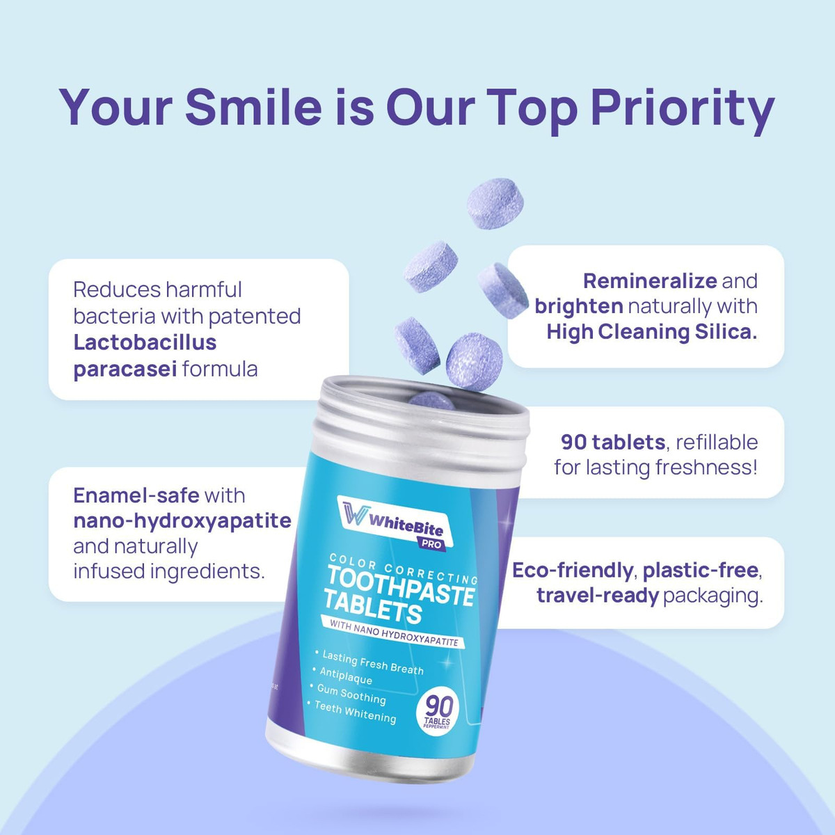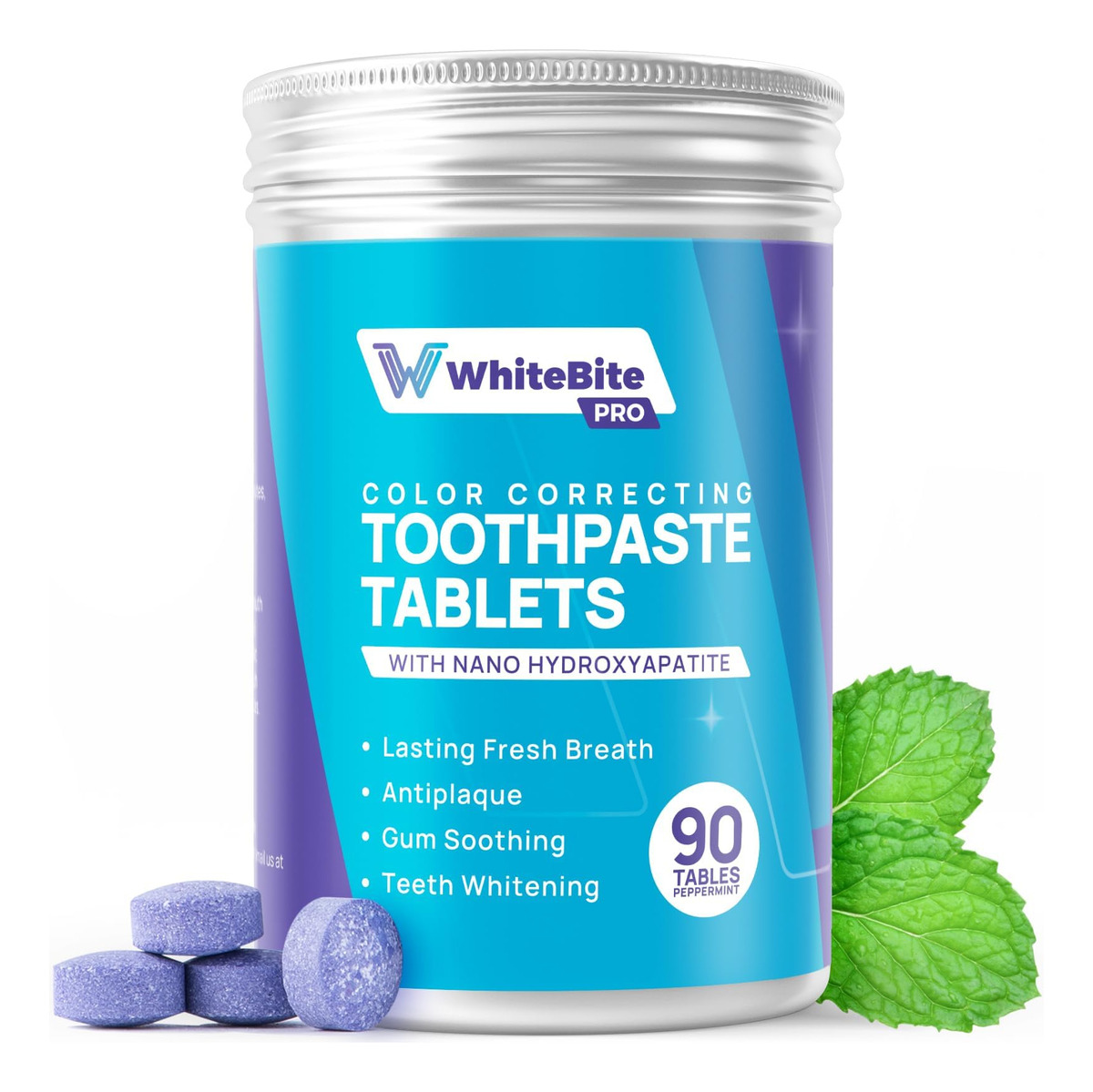 Comprimidos de creme dental corretor de cor – Rejuvenesça seu sorriso com NHA e probióticos: nossa fórmula avançada combina nanohidroxiapatita e probióticos importados de Lactobacillus para remineralizar naturalmente os dentes, iluminar seu sorriso e apoiar gengivas saudáveis, mantendo a flora oral ideal para uma saúde bucal superior. – Experimente um sabor refrescante de menta e uma textura suave: nossos comprimidos de pasta de dente oferecem um sabor refrescante de menta para um frescor duradouro ao mesmo tempo que apresenta uma textura suave e fácil de mastigar que se dissolve rapidamente, garantindo uma experiência de escovação limpa e agradável sempre. – Desfrute de 90 comprimidos para um frescor duradouro: nossos comprimidos de pasta de dente vêm em um frasco conveniente com 90 comprimidos, fornecendo um suprimento duradouro de higiene bucal limpa e refrescante. – Sem flúor e plástico para um limpador de amanhã: nossa fórmula elegante e recarregável de alumínio garante que você cuide da saúde bucal e do planeta. – Embalagem conveniente e ideal para viagens: nosso frasco de alumínio elegante e recarregável é perfeito para viagens, combinando conveniência com sustentabilidade.