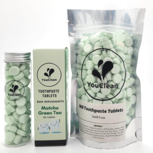 Os comprimidos de creme dental YouClean são uma nova forma de pasta de dente, que é pasta de dente em pó, sem água, prensada em comprimidos. Nossos comprimidos de creme dental também são isentos de flúor, SLS e produtos químicos. Costumávamos fazer um tablet de tamanho menor, mas agora tornamos nossos tablets 25% maiores. Ouvimos os comentários de nossos clientes, pois eles queriam mais espuma e mais “YouClean” em cada escovação. Então, “Ouvimos todos vocês!” O cilindro de vidro contém 90 comprimidos – perfeitos para viagens. O cilindro de vidro é ecológico, livre de plástico, reciclável e transparente, então você pode ver quando reabastecê-lo em nosso pacote de recarga de 365 tablets. O YouClean 365- Refill Pak também é uma resposta aos comentários de nossos clientes, pois eles querem o YouClean não apenas para viagens, mas também para o uso diário em casa. – Fabricado na Califórnia, EUA – Os comprimidos de creme dental YouClean são feitos de pasta de dente em pó, sem água, prensados em comprimidos. – Como usar – Coloque um comprimido na boca, mastigue e molhe a escova de dentes antes de escovar, como de costume. Enxágue, cuspa e sorria. – NANO-HIDROXIAPATITA + XILITOL + ÓLEO ESSENCIAL NATURAL – Uma combinação natural maravilhosa reconstrói o esmalte dos dentes, combate germes, limpa a boca e acalma os dentes. – SEM FLÚOR, PRODUTOS QUÍMICOS E GLÚTEN. Os comprimidos de pasta de dente YouClean removem suavemente manchas superficiais, pragas e tártaros. – FRASCO DE VIDRO FINO RECICLÁVEL/REUTILIZÁVEL – contém 90 comprimidos, material de limpeza suficiente para sua viagem e conveniente para seu uso diário.