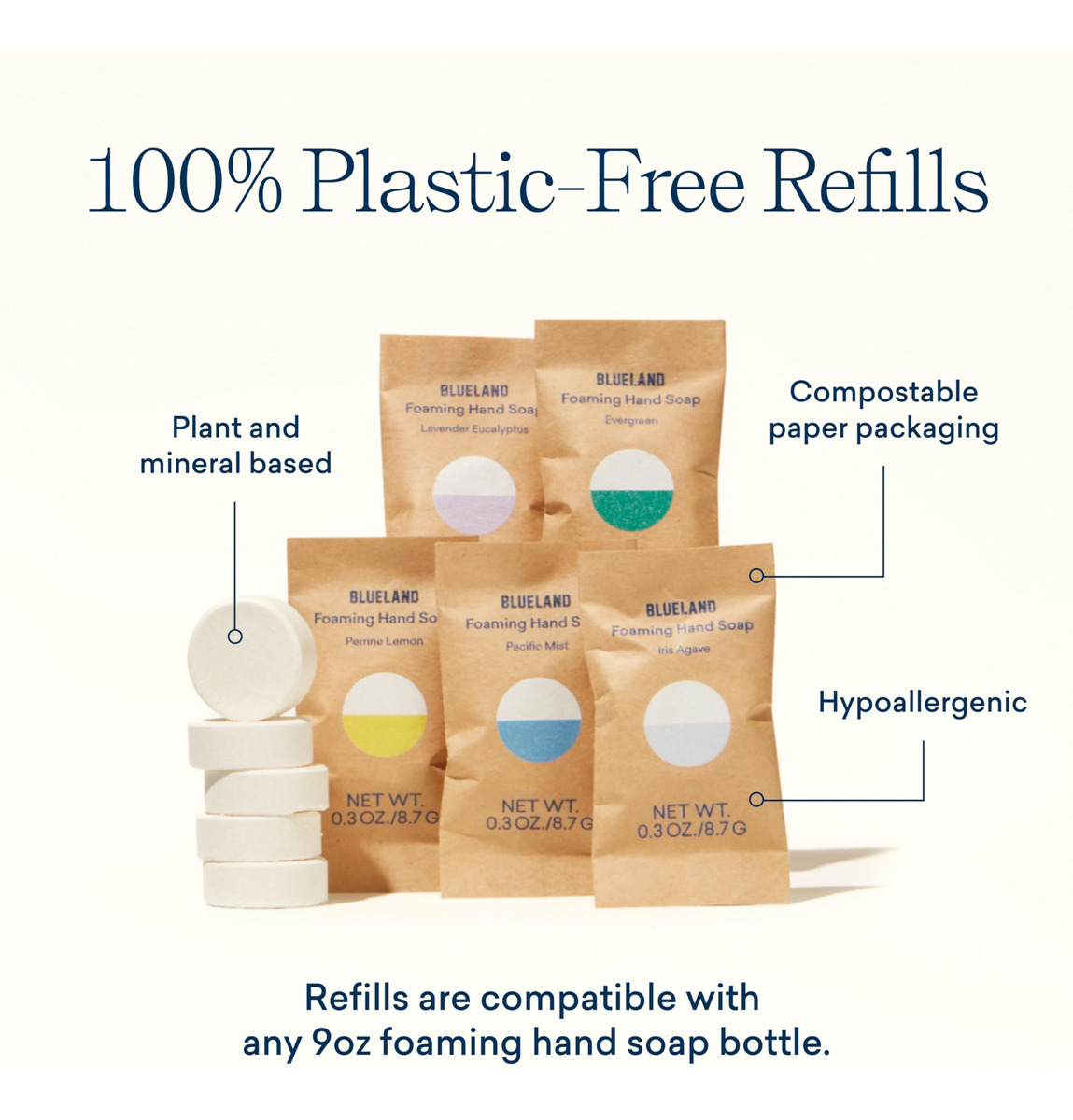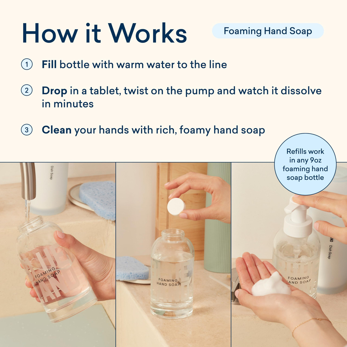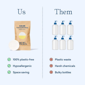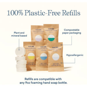 A nova melhor amiga da sua pia (literalmente, para sempre). Eliminamos o desperdício de plástico descartável dos sabonetes tradicionais para as mãos criando uma garrafa feita para durar para sempre. Basta encher com água, colocar um comprimido e pronto! Hidratante e espumoso na ponta dos dedos. Feito com poder de limpeza à base de plantas e minerais, nosso sabonete para mãos é seguro para uso em qualquer pessoa na casa. – TABLETES DE SABONETE ESPUMANTE PARA MÃOS SEM PLÁSTICO. Compre o frasco uma vez e reabasteça para sempre com comprimidos 100% sem plástico que vêm em embalagens compostáveis à base de papel. Nunca mais jogue fora outra garrafa de plástico. – COMO FUNCIONA. Basta encher o frasco com água e colocar em um comprimido e permitir que o comprimido se dissolva completamente para fazer 9 onças de sabonete espumante para as mãos. Os comprimidos são fáceis de armazenar e ocupam 10 vezes menos espaço do que o frasco tradicional. – INGREDIENTES LIMPOS. A limpeza à base de plantas e minerais remove a sujeira e a sujeira sem ingredientes agressivos ou resíduos de plástico. Feito com ingredientes humanos e ecológicos, livres de parabenos, corantes e ftalatos. – Seguro para crianças e animais de estimação. Hipoalergênico, certificado pela EPA Safer Choice, certificado Leaping Bunny, livre de crueldade, vegano, certificado pela B Corp e neutro em termos de clima. – Se você tiver algum problema com sua compra, se precisar de uma bomba nova ou de um aroma de recarga diferente, entre em contato com a equipe de atendimento ao cliente da Blueland e resolveremos o problema!