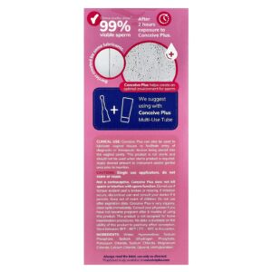 Não sendo um contraceptivo, o Conceive Plus não mata os espermatozoides nem interferir na função dos espermatozoides. Não use se o lacre inviolável estiver faltando ou rompido. Em caso de irritação, interrompa o uso e consulte seu médico se a irritação persistir. Mantenha fora do alcance de crianças. Não use após a data de validade. Conceive Plus é muito escorregadio, limpe o derramamento imediatamente. Consulte seu médico se você não engravidar após 6 meses de uso deste produto. Este produto não foi desenvolvido para procedimentos de insetração caseira. Não há dados disponíveis sobre a capacidade deste produto de afetar positivamente a concepção. Armazene entre 36 °F e 86 °F/2 °C e 30 °C nesta caixa.