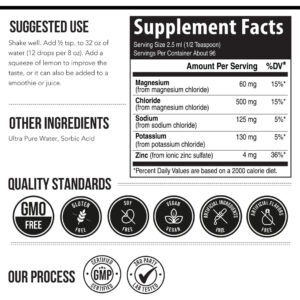 Ionic Lytes Electrolyte Concentrate (96 Servings) Sugar Free, Keto Electrolyte Drops, Perfectly Purified Ionic Electrolytes for Rapid Hydration 30% More Potassium, Magnesium & Zinc (8 oz) – BEST VALUE, HIGHEST MAGNESIUM, ZINC, AND POTASSIUM CONCENTRATIONS: Ionic Lytes is the most concentrated liquid electrolyte formula with 30% higher mineral levels. We also provide 96 servings per bottle compared to 48 servings from competing brands. Ionic Lytes delivers the best value of the highest quality liquid electrolytes. – PURIFIED, IONICALLY CHARGED SEA MINERALS: Ionic Lytes is made from a carefully sourced blend of sea minerals. Using an extraction and purification process, electrolytes are clean while maintaining their natural ionic charge and small particle size. – RAPID CELLULAR HYDRATION: Achieve total body hydration at the cellular level. Assists in improving athletic performance & recovery, enhancing mental clarity, reducing signs of aging, improving energy levels, and supporting overall health.* – NON-FLAVORED, SUGAR-FREE, KETO-FRIENDLY: Please note Ionic Lytes is not focused on taste. It has a salty, mineral taste. If you are sensitive to taste, consider adding a squeeze of lemon or add to smoothie or juice. It is 100% Keto Approved. – MADE IN THE USA, 3RD PARTY TESTED, cGMP FACILITY: All our products are proudly produced in a cGMP certified facility in the USA, and 3rd party tested for purity, concentration & efficacy. Ionic Lytes is vegan, non-GMO, sugar-free, artificial ingredient free, kosher, and Halal approved. *** Update: Packaging has been improved to ensure product does not arrived damaged.***