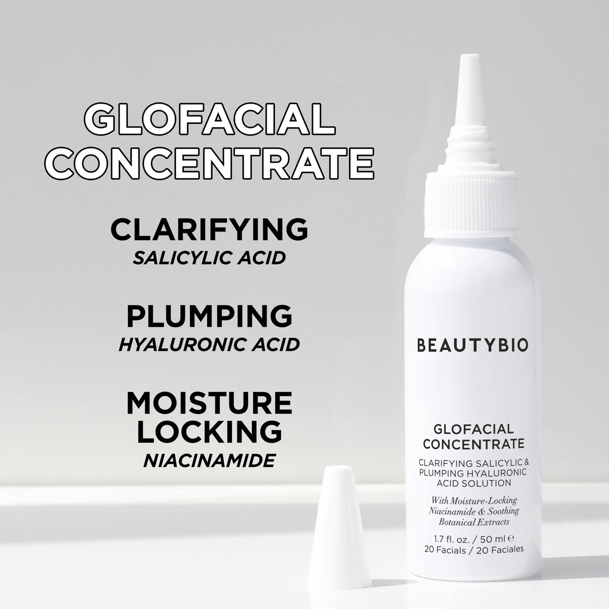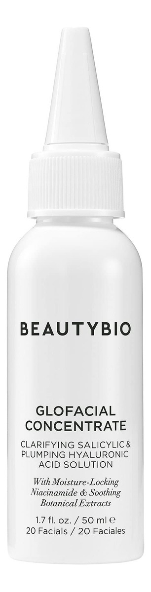 Concentrado GloFacial. Solução de ácido salicílico clareador e ácido hialurônico que preenche o volume — Um concentrado clareador e preenchedor formulado para ressurgir e hidratar, minimizando a aparência de poros congestionados para uma pele calma e brilhante — Ajuda a ressurgir instantaneamente — Ilumina o tom da pele — Hidrata a pele — Minimiza a aparência de poros congestionados