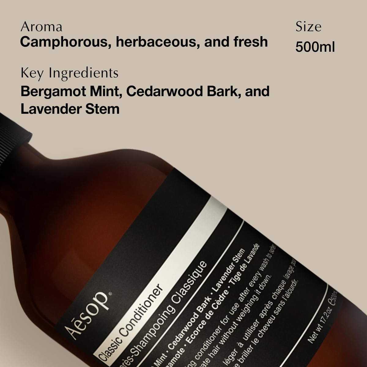 Condicionador Aesop Classic | Condicionador de cabelo natural de 17,7 onças para cabelos secos e danificados | Condicionador de cabelo profundo sem parabenos, sem crueldade e vegano para homens e mulheres | Produto capilar para todos os tipos de cabelo – HIDRATA E SUAVIZA O CABELO: óleos botânicos com propriedades hidratantes e suavizantes impressionantes se misturam com proteína vegetal hidrolisada para nutrir, hidratar, desembaraçar e alisar levemente o cabelo. – CÂNFORO, AROMA HERBÁCEO E FRESCO: Nosso condicionador hidratante tem um aroma cânforo, herbáceo e fresco que enriquece sua mente e corpo à medida que o dia avança, enquanto mantendo o cabelo macio, flexível e hidratado. – INGREDIENTES BOTÂNICOS: Este condicionador de cabelo orgânico tem uma textura cremosa leve formulada com bergamota, casca de cedro e caule de lavanda, cuidadosamente selecionada por suas propriedades antifúngicas e antibacterianas. – USO: expulse o excesso de água do cabelo após a lavagem. Coloque o produto nas mãos e aplique no comprimento médio e nas pontas dos cabelos. Use um pente de dentes largos para garantir uma distribuição uniforme. Deixe agir de dois a três minutos antes de enxaguar completamente. – LIVRE DE CRUELDADE: Todos os produtos da Aesop são veganos e não testamos nossas formulações ou ingredientes em animais.
