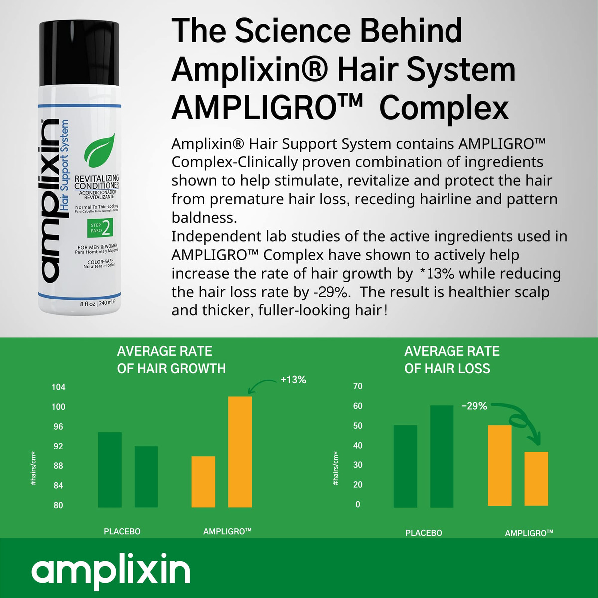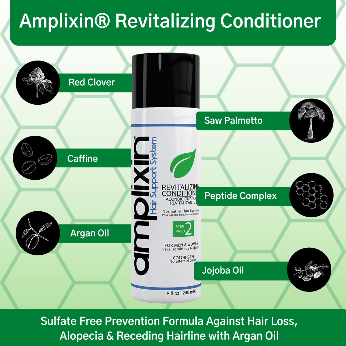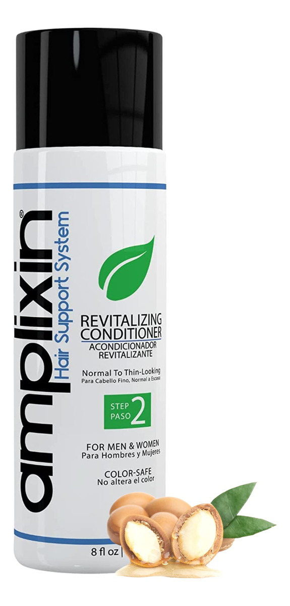 O condicionador revitalizante é a segunda etapa do sistema Amplixin Hair Support que penetra profundamente para hidratar o couro cabeludo e os folículos pilosos. O óleo Agran totalmente natural ajuda a dar volume aos fios frágeis e a melhorar a sensação e a textura do cabelo. Quando combinado, o Amplixin Hair Support System fornecerá resultados rápidos e duradouros sem efeitos colaterais prejudiciais ao couro cabeludo, fios ou folículos. – RESULTADOS CLINICAMENTE DEMONSTRADOS EM 1 SEMANA – Mistura de ingredientes formulada cientificamente, apoiada por estudos clínicos e comprovada que ajuda a prevenir queda de cabelo, calvície e queda da linha do cabelo em homens e mulheres com cabelos de aparência normal. Aumenta a espessura em menos de 1 semana com o uso diário. – COMBATE A QUEDA DE CABELO, NATURALMENTE COM NOSSO COMPLEXO AMPLIGRO DESENVOLVIDO CIENTIFICAMENTE – Trevo vermelho, peptídeos biomiméticos e cafeína ajudam a estimular o couro cabeludo a diminuir a queda de cabelo, estimulam o crescimento do cabelo e ajudam a bloquear os efeitos negativos da diidrotestosterona (DHT). – SEM SULFATO COM ÓLEO DE ARGAN – O condicionador revitalizante Amplixin para queda de cabelo é sulfato livre de parabenos e sem crueldade, sem produtos químicos agressivos que podem irritar e secar o couro cabeludo ou o cabelo. O óleo de argan de qualidade premium adicionado ajuda a condicionar profundamente as raízes para restaurar a umidade necessária para ciclos ideais de crescimento capilar. – Restaure seu cabelo rapidamente – Simplificando, sim, esse condicionador revitalizante funciona. Amplixin usa a ciência para ajudá-lo a se parecer com você novamente. Ideal para todos os tipos de cabelo – normais, secos, oleosos, danificados, coloridos ou étnicos. – Feito com orgulho nos EUA – Fabricado em instalações de última geração usando apenas ingredientes botânicos e bloqueadores de DHT de alta qualidade cuidadosamente pesquisados. Condicionador de óleo de argan para queda de cabelo para crescimento de cabelo masculino e feminino.