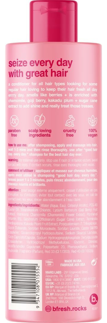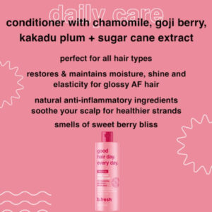 não deixe que um dia ruim de cabelo atrapalhe nunca mais. Nosso condicionador de cuidado diário visa dar ao cabelo e ao couro cabeludo um pouco de amor regular para que seus cabelos fiquem deliciosos dia após dia. Camomila e goji berry são antiinflamatórios naturais que atuam no couro cabeludo acalmando qualquer sensibilidade ou inflamação. um couro cabeludo saudável = crescimento saudável do cabelo com AF. Extrato de cana-de-açúcar + kakadu A ameixa funciona nessas mechas para restaurar e manter a umidade, o brilho e a elastina, proporcionando cabelos brilhantes e saudáveis o dia todo, todos os dias. – serve para todos os tipos de cabelo + eu sou ótimo para cuidar o cabelo regularmente do dia a dia – sou enriquecido com camomila, goji berry, ameixa kakadu e extrato de cana-de-açúcar para tratar suas madeixas – meu perfume deixará você feliz – sem parabenos. Sem crueldade. Ingredientes que adoram o cabelo. fragrância natural. ideal para veganos. – aplique generosamente nos cabelos molhados. Massageie até formar uma espuma e enxágue bem. Siga com bom dia do cabelo. todos os dias. condicionador para o melhor dia de cabelo possível.