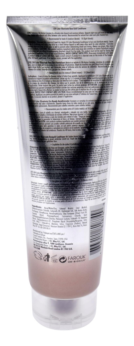 Condicionadores CHI Ionic Color Illuminate – 95% naturais. Sem sulfato, parabenos e glúten — 8,5 onças — Ingredientes: água/água/água, álcool cetearílico, álcool cetílico, cloreto de behentrimônio, ceteareth-20, seda hidrolisada, aminoácidos da seda, pantenol, dimeticona, amodimeticona, óleo de fruta Olea Europaea (oliva), caprilglicol, fenoxietanol, cetricona Cloreto de guar hidroxipropiltrimônio, sorbato de potássio, trideceth-10, hexilenoglicol, poliquatérnio-37, dicaprilato/dicaprato de propilenoglicol, ácido cítrico, Ppg-1 Trideceth-6, alumina, sílica, fragrância (perfume), benzoato de benzila, butilfenilmetilpropional, Hexil Cinamal, Dióxido de Titânio (Ci 77891), Vermelho Básico 76, Azul Básico 99.