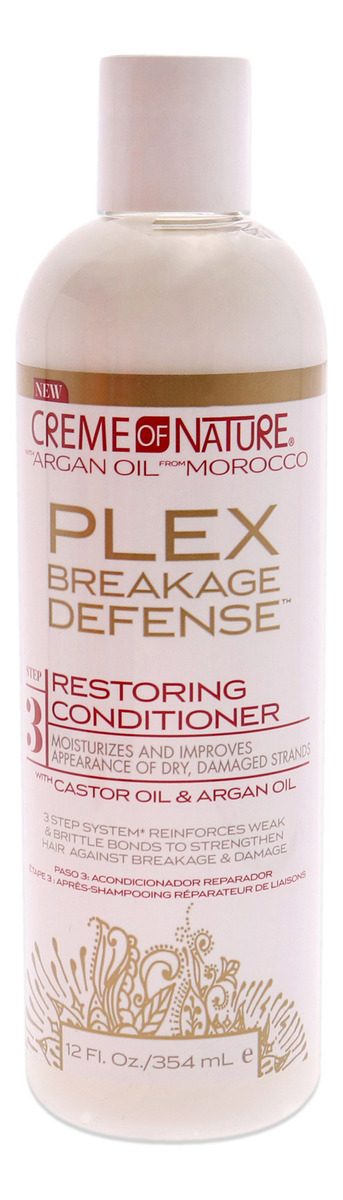 O condicionador restaurador Creme of Natures PLEX hidrata os cabelos danificados com óleo de argan marroquino e óleo de rícino. Ele reforça os cabelos fracos e quebradiços contra quebras com sua fórmula especialmente projetada.