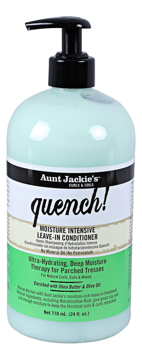 Aunt Jackie's Curls and Coils Quench, bomba grande de 24 onças de tamanho familiar, condicionador de cabelo leave-in intensivo para cachos, bobinas e ondas naturais, enriquecido com manteiga de karité, verde – Bomba familiar de 24 onças, condicionador leave-in intensivo Aunt Jackie's Quench Moisture – Oferece um ótimo deslizamento e umidade suficiente para manter os cabelos mais sedentos refrescados – Ajuda a eliminar o ressecamento, sem sensação de peso — Enriquecido com manteiga de karité, azeite de oliva extra virgem e raiz de marshmallow — Para cabelos com cachos, espirais e ondas naturais