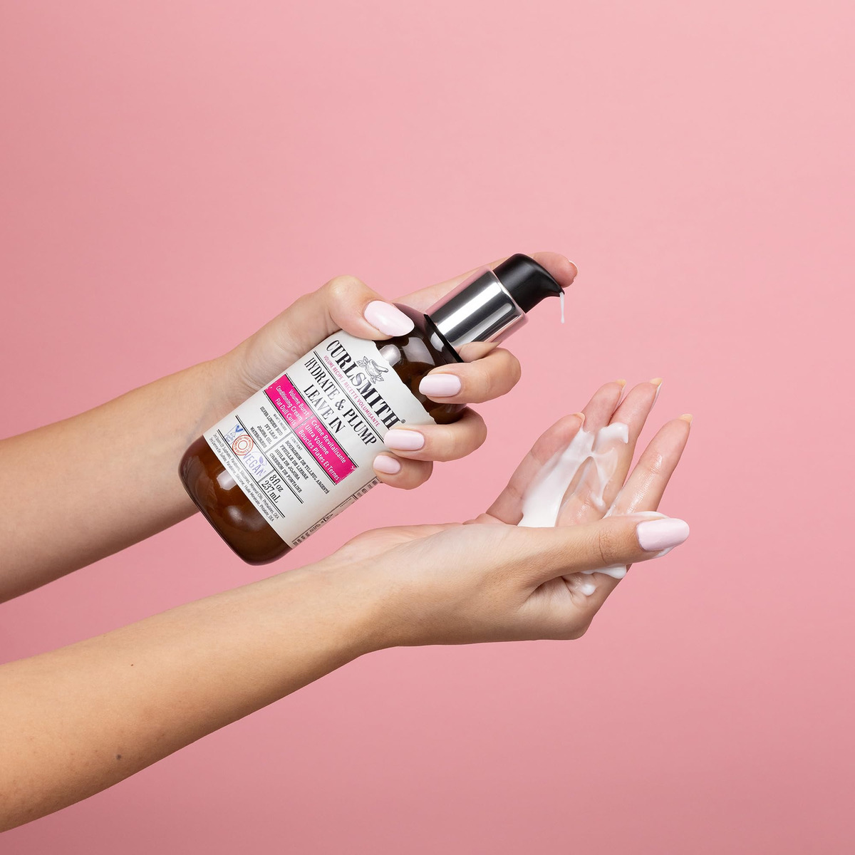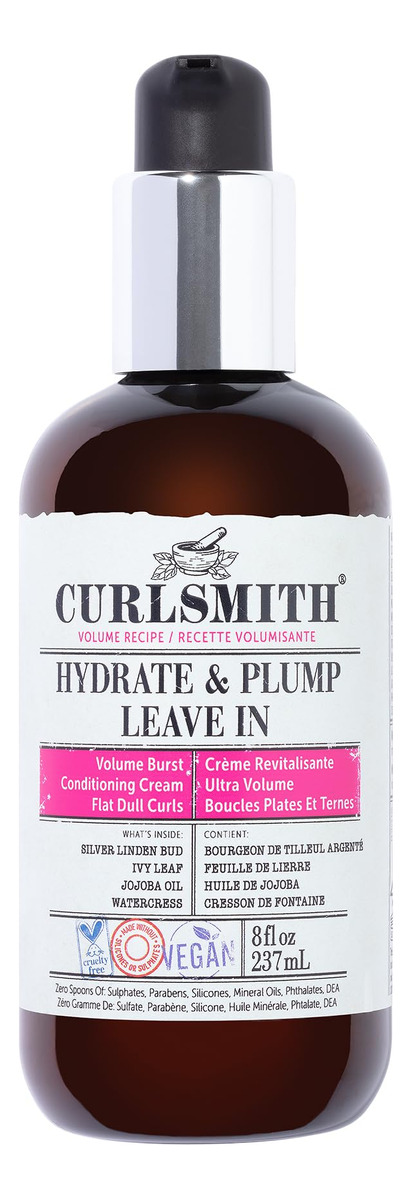 CURLSMITH — Condicionador de cabelo Hydrate & Plump Leave In, volumizador e nutritivo para cabelos ondulados, encaracolados ou crespos, vegano (237 ml/8 fl oz) — VOLUMIZING LEAVE IN — Um condicionador leave-in que nutre o córtex para ajudar a dar volume aos cabelos volumosos e hidratados. Para todos os tipos de cachos, particularmente benéfico para cabelos finos a médios, mas também combina com texturas mais grossas. – COMO A MÁGICA ACONTECE – Um hidratante sem enxágue rico em folha de hera, óleo de jojoba e agrião, contendo nosso complexo exclusivo de células-tronco à base de plantas conhecido por nutrir o córtex capilar para deixar cachos mais cheios, grossos e elásticos. Use depois do limpador de corpo inteiro sem peso e do condicionador de leite corporal para obter melhores resultados. – O QUE NOS TORNA DIFERENTES – Inspirado em gerações de remédios caseiros para o cabelo, o Curlsmith combina alimentos frescos que adoram cachos com itens básicos do armário de cozinha e ingredientes naturais raros para criar produtos premium que realmente funcionam. Ingredientes saudáveis, resultados profissionais, sem concessões. – SEM DESAGRADÁVEIS – Todos os nossos produtos têm zero colheres de sulfatos, silicones, óleos minerais e ftalatos. Além disso, eles são cacheados para meninas, são 100% veganos e livres de crueldade. – CURL JOURNEY – Curlsmith acredita que os cachos não precisam ser complicados, e é por isso que temos a missão de eliminar as suposições. Estamos aqui para ajudá-lo em sua jornada de curvas, independentemente de você ter as ondas mais soltas até as bobinas mais estreitas ou qualquer coisa intermediária.