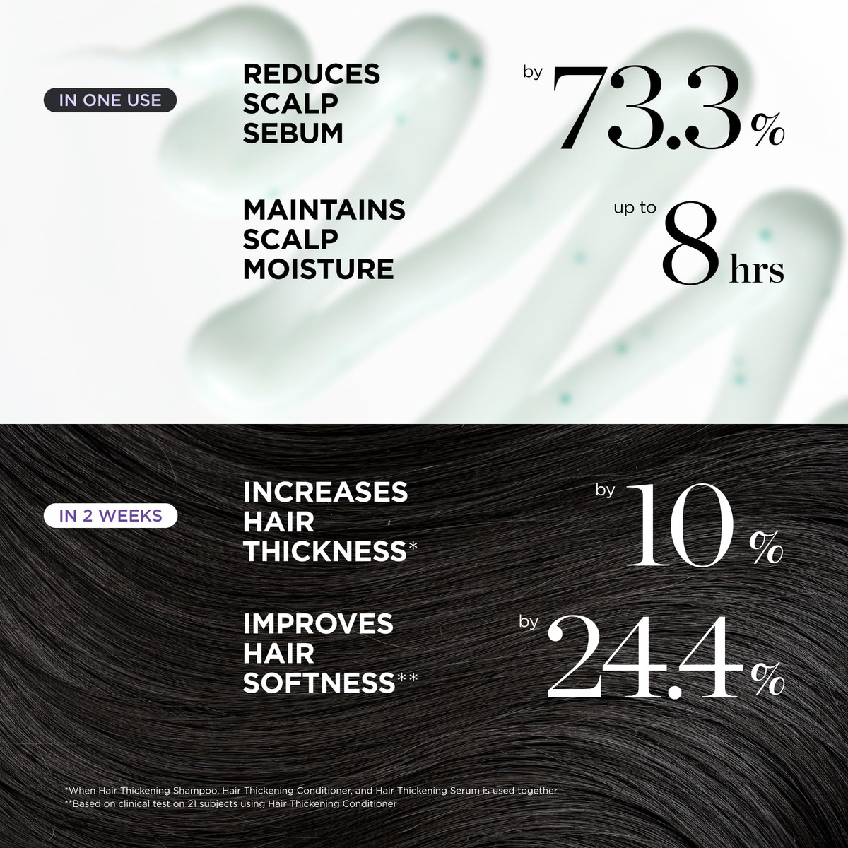 Este condicionador excepcional foi projetado especificamente para deixar seu cabelo mais espesso e cheio. Formulado com biotina e prebióticos encapsulados, ele amplifica o volume do cabelo enquanto fortalece cada mecha. A base de creme protéico e as cápsulas nutritivas de alecrim trabalham juntas para tratar o cabelo e o couro cabeludo, promovendo um crescimento capilar mais saudável e denso. Experimente a transformação definitiva em cabelos grossos e luxuosos a cada uso. – CLINICAMENTE COMPROVADO: em 2 semanas REDUZ A PERDA DE CABELO devido à quebra em 82,2% */Melhora a maciez do cabelo em 24,4%. Após um uso: reduz o sebo do couro cabeludo em 73,3% e repara os cabelos danificados. Benefícios adicionais: melhora a hidratação do couro cabeludo em 34,2% – Este condicionador aumenta a espessura do cabelo e reduz a queda de cabelo relacionada à quebra. Enriquecido com biotina e prebióticos encapsulados, ele aumenta o volume e fortalece cada fio. Sua base de creme proteico e cápsulas de alecrim nutrem o cabelo e o couro cabeludo, promovendo um crescimento mais saudável e completo. – ESFOLIA, LIMPA E HIDRATA, AUMENTANDO A CIRCULAÇÃO E ESTIMULANDO O CRESCIMENTO E A FORÇA DO CABELO. Formulado com biotina, extrato de folha de alecrim, ácido salicílico, pantenol, niacinamida, cafeína e formulado sem parabenos, silicones, sulfatos e glúten. – #1 Marca coreana de cuidados com o cabelo para espessamento capilar (fonte de dados – Nielsen 2023) – Testado dermatologicamente e seguro para cabelos tingidos.