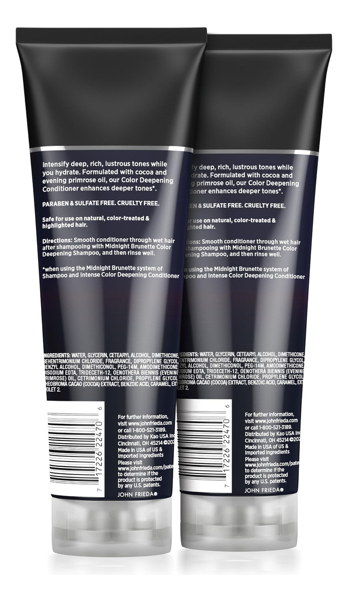 Condicionador John Frieda Brilliant Brunette, de cor visivelmente mais profunda, com óleo de prímula, infundido com cacau, 8,3 onças (pacote com 2) – Cor morena mais profunda – Descubra uma cor morena mais profunda para cabelos naturais ou tratados com nossa combinação exclusiva de ingredientes naturais – cacau natural e óleo de onagra. – Hidratação rica e profunda – Leve sua morena para o próximo nível enquanto experimenta hidratação e hidratação profundas em seu cabelo. – Cacau natural e óleo de prímula ÓLEO DE PRÍMULA — Esta mistura de ingredientes foi projetada especificamente para elevar sua cor morena e dar seus tons indulgentes de cabelos escuros. – CABELOS NATURAIS E COM CORES TRATADAS – Quer sua morena seja natural ou tratada, o condicionador John Frieda Visibly Deeper ajudará sua cor a atingir a riqueza que você deseja. – TEXTURA E PESO SAUDÁVEIS – Infundido com ingredientes naturais projetados para limpar e hidratar o cabelo, ao mesmo tempo em que intensifica a cor de todos os tons de morena.