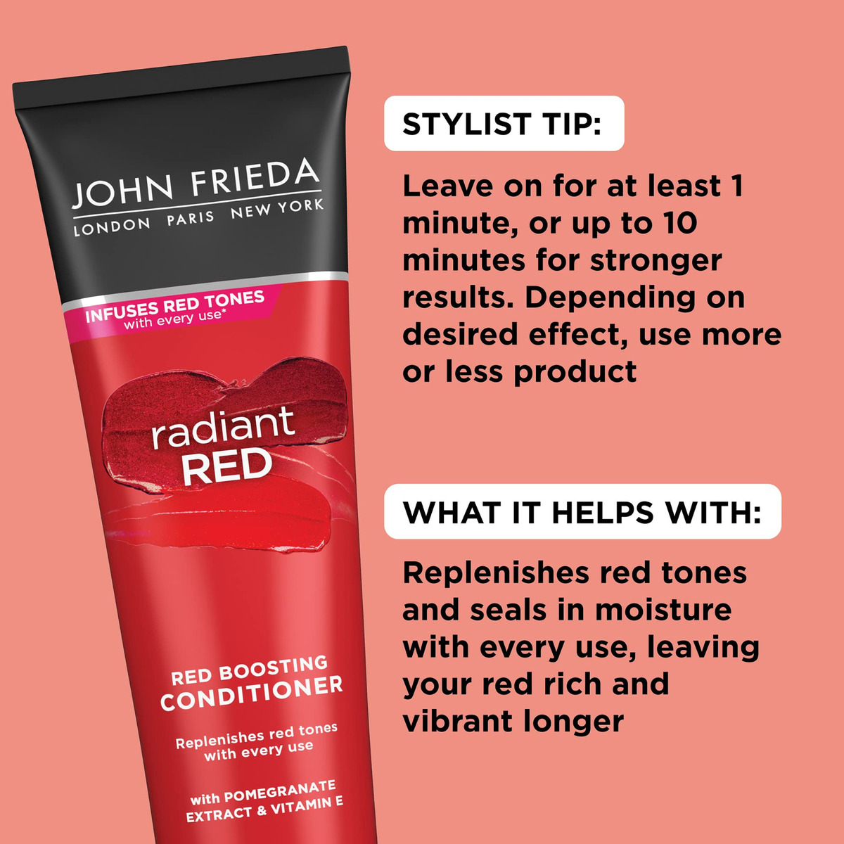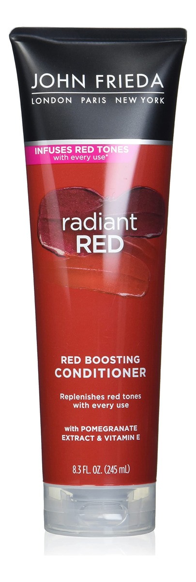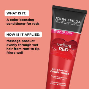 O condicionador John Frieda Radiant Red Red Hair, condicionador diário profundo, com romã e vitamina E, ajuda a repor os tons de cabelo ruivos, 8,3 onças (pacote com 2) — Protetor de cor de cabelo — Infunde e repõe os tons vermelhos enquanto mantém a hidratação — FORMULADO COM INGREDIENTES DE QUALIDADE — Formulado com extrato de romã e vitamina E, o condicionador John Frieda Radiant Red Boosting aumenta a maciez e brilho — Suave para cabelos tingidos — Seguro para todos os tons de cabelos ruivos naturais e coloridos — Suave para uso diário — Use sempre que lavar — Combine com LINHA DE PRODUTOS RADIANT RED — Para obter melhores resultados, use com o shampoo John Frieda Radiant Red Red Boosting
