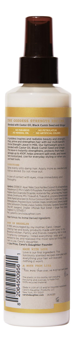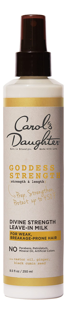 Condicionador Carol's Daughter Leave In, 8,5 onças fluidas, leite de cabelo Goddess Strength Divine Strength com óleo de rícino para cabelos fracos, ondulados, crespos e encaracolados – Spray condicionador fortalecedor Leave in: fortalece instantaneamente o cabelo e atua como protetor térmico para cabelos naturais contra danos causados pelo calor de até 450° F, ajuda a evitar pontas duplas e atua como desembaraçador de cabelos encaracolados hidratados: nosso O condicionador Leave in é misturado com óleo de rícino, semente de cominho preto e gengibre. Nosso leite leve multibenefícios prepara, prepara, fortalece e hidrata o cabelo — Para cabelos fracos e propensos a quebrar: produtos anti-quebra de cabelo reforçam a força do cabelo à medida que ele cresce e fica mais longo. Proporciona cabelos 15 vezes mais fortes e 94% menos quebras em 1 uso com sistema de xampu, condicionador, óleo e creme Leave in em vez de shampoo não condicionador — Para melhor uso: borrife o condicionador Leave in de maneira uniforme nos cabelos úmidos. Aplique mais produto para o cabelo conforme necessário e modele conforme desejado. Use este versátil tratamento anti-quebra de cabelo para pentear o dia a dia ou como protetor térmico do cabelo. Fundada pela Black Woman: Lisa Price fundou a Carol's Daughter em sua cozinha no Brooklyn em 1993. Ela criou esta coleção de produtos para o cabelo para ajudar o cabelo natural a recuperar seu equilíbrio natural de umidade, maleabilidade, brilho e maciez