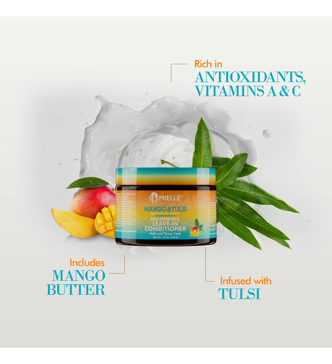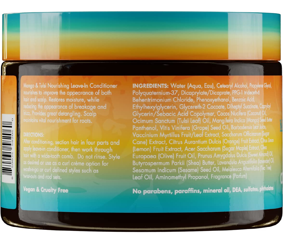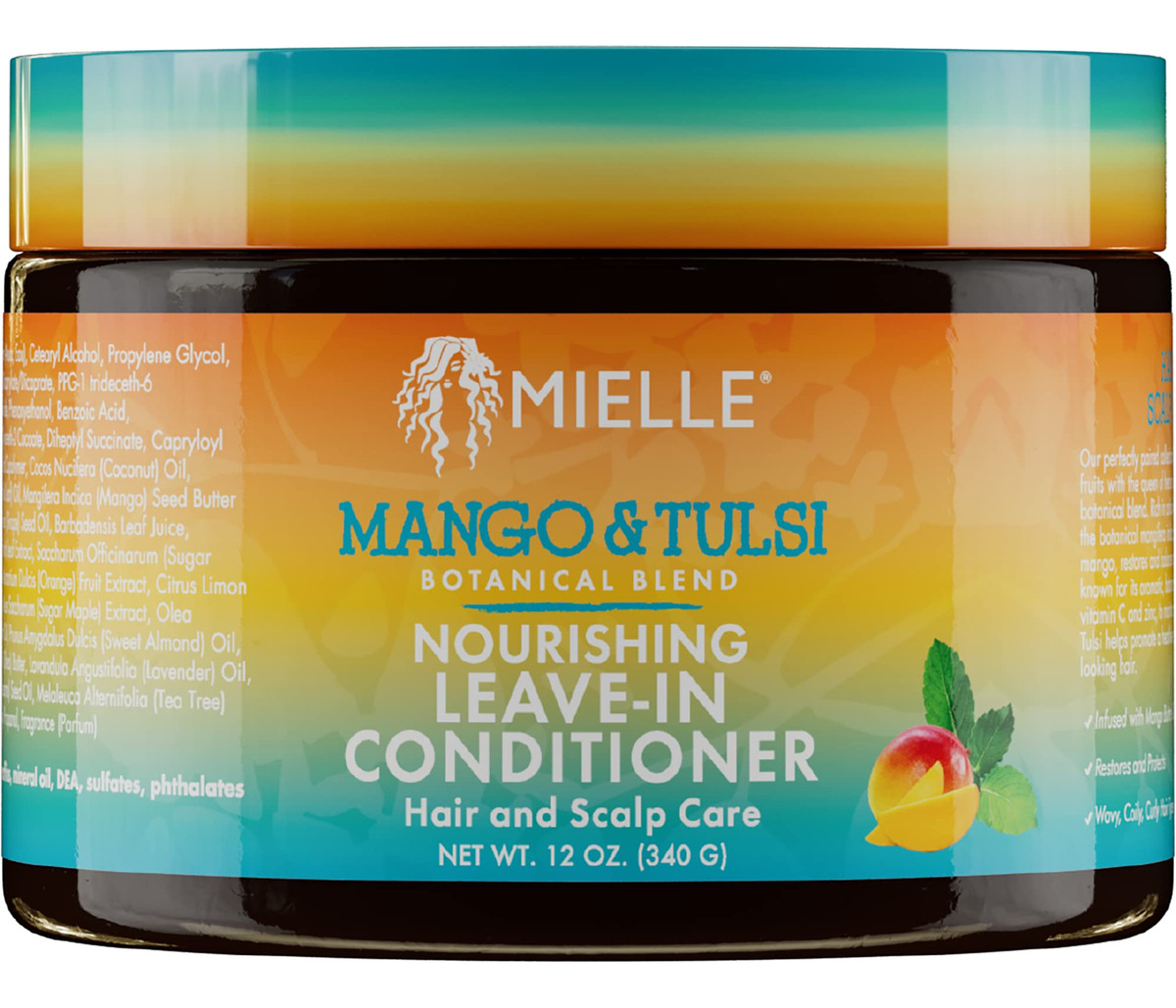 Condicionador nutritivo Leave-In Mielle Organics Mango & Tulsi para cabelos ondulados e encaracolados, hidrata, desembaraça e fortalece, vegano e livre de crueldade, 12 onças — hidrata e nutre profundamente cabelos ondulados e encaracolados com manteiga de manga e extrato de tulsi, ricos em vitaminas e minerais essenciais para cabelos saudáveis — Reduz a quebra, o crespo e a folhagem, deixando os cachos definidos, elástico e manejável para um acabamento caseiro com qualidade de salão – Fortificado com vitaminas A, C e E, além de antioxidantes, para proteger o cabelo dos danos ambientais e mantê-lo com a melhor aparência – Vegano, livre de crueldade e formulado sem produtos químicos agressivos, como sulfatos, parabenos e óleo mineral, para ser suave para cabelos e couro cabeludo – Seguro para cabelos tingidos e adequado para todos os tipos de cabelo, incluindo cabelos encaracolados, crespos e crespos