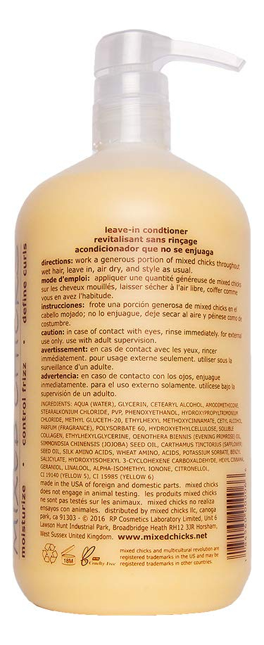 Condicionador leave-in Mixed Chicks Curl Defining & Frizz Eliminating, 33 fl.oz. — O condicionador Mixed Chicks Leave in hidrata e condiciona seus cachos até a perfeição com sua formulação exclusiva e ingredientes premium. Dá brilho, maciez e maleabilidade. – O cabelo é continuamente exposto a condições e substâncias que o ressecam e o tornam mais suscetível a danos – Coloração, tratamentos químicos, ferramentas de modelagem, exposição ao sol abrem as cutículas do cabelo para evitar danos – O óleo de jojoba dá brilho, condiciona o cabelo e o couro cabeludo e ajuda a manter a cor; o óleo de prímula nutre e fortalece o cabelo e o couro cabeludo – O óleo de jojoba mantém o cabelo selado e prepara o cenário para estilizar; pense nele como seu herói do frizz, o desembaraçador dos seus sonhos