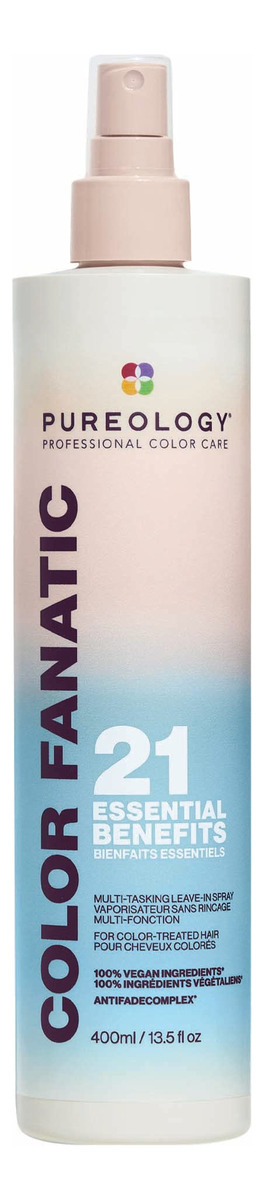 Condicionador Leave-in Pureology Color Fanatic Spray desembaraçador para tratamento capilar | Protege a cor do cabelo do desbotamento | Protetor térmico | Vegano | 13,5 fl oz – Spray multibenefício sem enxágue: spray condicionador vegano Color Fanatic com 21 benefícios, prioriza e protege o cabelo do calor, protege a cor do cabelo do desbotamento e hidrata todos os tipos de cabelo – Fórmula multitarefa: hidrata e desembaraça o cabelo A névoa prepara o cabelo para todas as necessidades de modelagem; o azeite de oliva confere brilho e maciez, enquanto os óleos de camelina e coco ricos em ômega-3 nutrem e hidratam — Principais benefícios: Hidrata cabelos secos e danificados, fortalece e repara os danos, protege contra danos causados pelo calor e desbotamento da cor, equilibra o pH do cabelo, desembaraça, suaviza e dá brilho a todos os tipos de cabelo. Uso sugerido: use como sua primeira etapa de modelagem que prepara e protege; borrife o cabelo limpo e úmido e penteie uniformemente. Em seguida, estilize como de costume. Use antes de outros produtos de modelagem da Pureology – Com a confiança de salões e profissionais, o spray condicionador Leave-In Color Fanatic da Pureology é vegano e sem sulfato. Use o Color Fanatic antes de outros produtos de modelagem da Pureology para proteção de cores