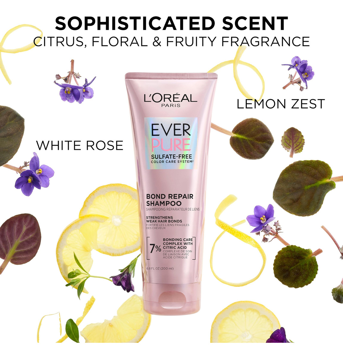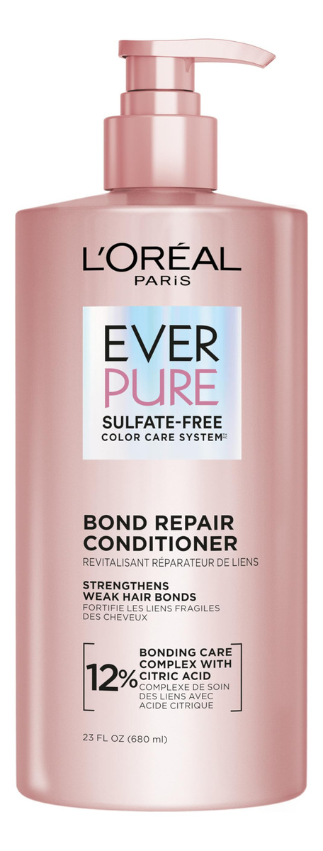 Condicionador L'Oreal Paris Bond Repair sem sulfato para cabelos danificados, fortalece os cuidados com o cabelo com ácido cítrico, repara as ligações fracas do cabelo, EverPure, 23 fl oz — Condicionador para cabelos tingidos: tratamento pré-shampoo EverPure, condicionador e óleo em sérum fortalecem as ligações fracas, reduzem a quebra, fornecem hidratação e suavidade duradoura + proteção de cor para cabelos sedosos e lisos – Produtos para fortalecer o cabelo: nosso reparo de ligações Pré-shampoo, xampu, condicionador e soro com óleo para tratamento de cores, branqueado, danificado, fraco, frágil e fino o cabelo reforça as ligações fracas com o ácido cítrico. Com um aroma floral com notas de rosa e sândalo – Para obter melhores resultados: aplique o concentrado pré-shampoo Bond Repair nos cabelos molhados. Enxágue. Em seguida, aplique o shampoo e condicionador Bond Repair. Enxágue. Termine com o tratamento capilar Bond Repair Oil-in-Serum. Deixe entrar e modelar – Nosso mais puro respeito pelo seu cabelo: os produtos para o cabelo EverPure foram formulados sem sulfatos, laurilsulfatos de sódio, parabenos, adição de ftalatos, ingredientes de glúten, hidantoína DMDM e corantes. Sempre vegana, cuidadora de cores e movida pela ciência – Inovação da L'Oreal Paris: Somos uma empresa de cuidados de beleza que combina o que há de mais moderno em tecnologia com a mais alta qualidade para obter o máximo em cor de cabelo, cuidados com o cabelo, estilo de cabelo, cuidados com a pele e cosméticos