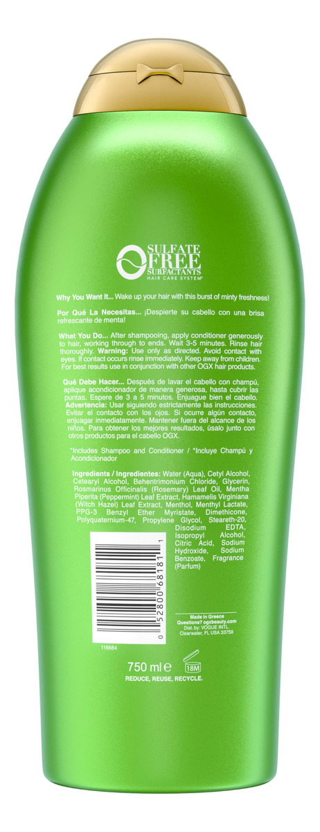 Condicionador OGX Extra Strength Refreshing Scalp + Rosemary Mint, condicionador nutritivo com infusão de menta alecrim para cabelos brilhantes e saudáveis, surfactantes sem sulfato, 25,4 fl. Oz – REFRESQUE E NUTRA: este frasco de 25,4 onças fluidas do condicionador de cabelo OGX Extra Strength Refreshing Scalp + Rosemary Mint com hamamélis deixa o cabelo brilhante e saudável – REVIGORANTE ROSA SEMARY & MINT: Da marca #1 de reparação capilar, * este condicionador de cabelo extra forte é infundido com alecrim e hortelã para ajudar a refrescar seus cabelos oleosos e revigorar seus sentidos com um creme de menta formigle – WITCH HAZEL: Este condicionador é formulado com hamamélis, um adstringente suave conhecido por ajudar a remover resíduos e acúmulos sem descascar o cabelo enquanto nutre o couro cabeludo. A fórmula leve condiciona e dá ao cabelo uma explosão de frescor – NUTRA SEU COURO CABELUDO: após a lavagem, aplique o condicionador generosamente no cabelo, espere de 3 a 5 minutos e enxágue para deixar as mechas brilhantes e macias. O condicionador diário é formulado sem surfactantes e corantes sulfatados – ROTINA DE CUIDADOS COM O CABELO OLEOSO: os aromas de menta e alecrim deixam o cabelo revigorado e com um cheiro refrescante e limpo. Para obter melhores resultados, use este condicionador de cabelo oleoso com toda a coleção de cuidados capilares OGX Extra Strength Refreshing Scalp + Rosemary Mint