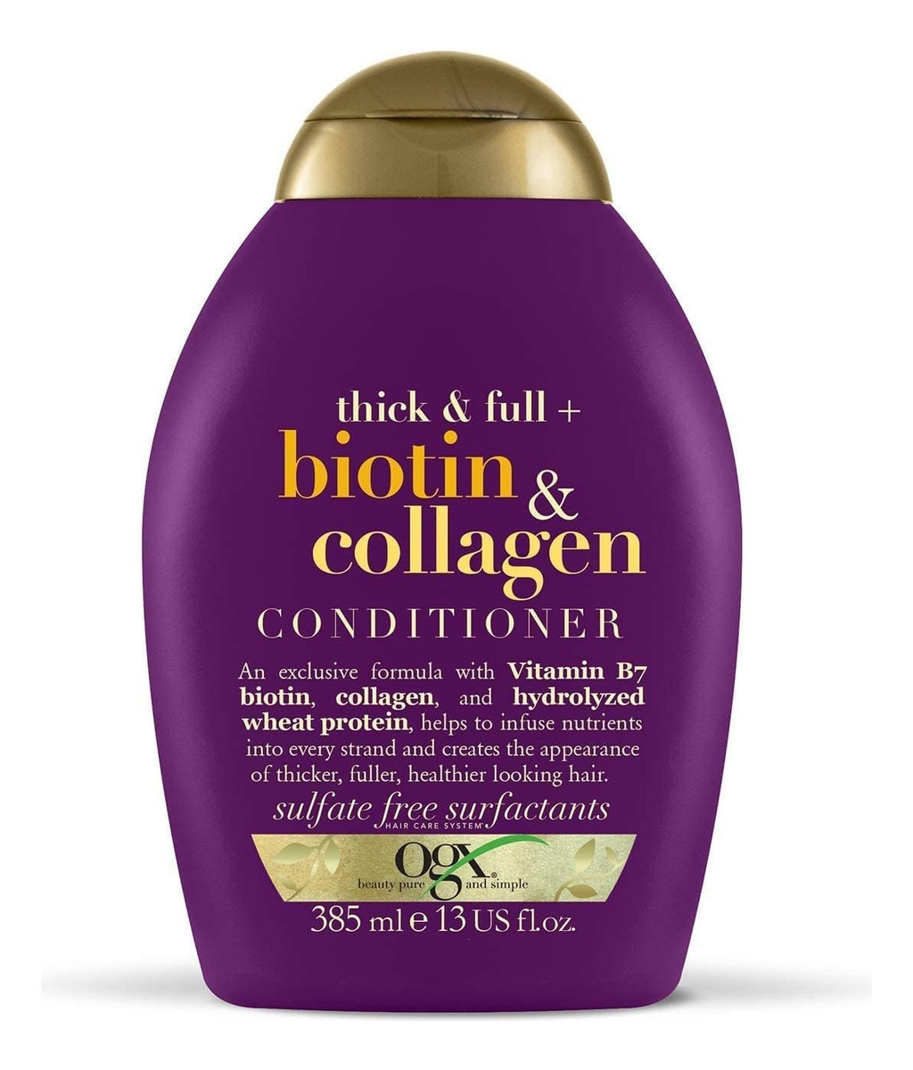 Condicionador volumizador de biotina e colágeno OGX Thick & Full + para cabelos finos, com vitamina B7 e proteína de trigo hidrolisada, surfactantes sem parabenos e sem sulfato, 13 fl oz – Dê um belo impulso aos cabelos finos com o poder espessante deste condicionador volumizante rico em nutrientes. Infundido com vitamina B7, biotina e colágeno, deixa os cabelos mais cheios e saudáveis – AUMENTE O VOLUME: O frasco de 13 onças fluidas do condicionador OGX Thick and Full plus de biotina e colágeno dá aos fios finos um aumento de espessamento, tornando-os mais volumosos e abundantes mechas — Mais grossas, cheias e saudáveis: ideal para cabelos lisos a médios, esse condicionador volumizador deixa o cabelo mais espesso e com aparência saudável, pois ajuda a desembaraçar o cabelo — Cuidados com o cabelo INSPIRADOS NA NATUREZA: a fórmula rica em nutrientes e volumosa contém vitamina B7 biotina, que ajuda a fortalecer o cabelo para manter o crescimento, colágeno, um alicerce para cabelos saudáveis, e proteína hidrolisada de trigo — EXPERIÊNCIA SENSORIAL COMPLETA: O aroma de bergamota, jasmim e baunilha deixa seus cabelos cheirando irresistivelmente bem toda vez que você ensaboa. Além disso, sem sulfato O sistema de tratamento capilar surfactante é isento de parabenos e é suave para suas madeixas