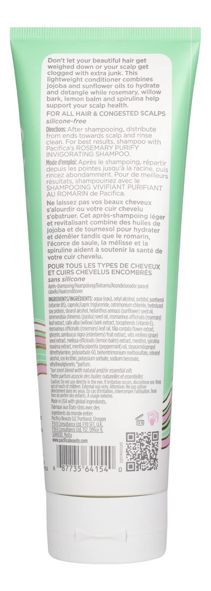 Condicionador revigorante Pacifica Beauty, Rosemary Purify, calmante de menta, hidrata e nutre o couro cabeludo, leve, desembaraça, sem sulfato, sem silicone, vegano e sem crueldade – Condicionador leve para hidratação equilibrada – Cheira a menta fresca – Casca de salgueiro, erva-cidreira e espirulina ajudam a manter a saúde do couro cabeludo – Para todos os tipos de cabelo, especialmente couro cabeludo congestionado – Aplique após a lavagem, distribua das pontas ao couro cabeludo e enxágue bem.