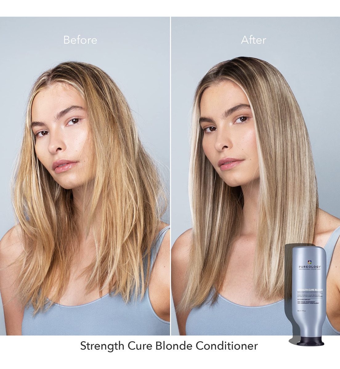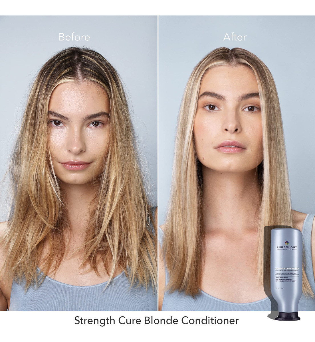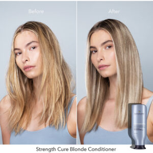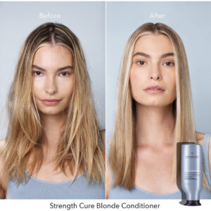 Condicionador Pureology Strength Cure Blonde Purple para cabelos loiros e clareados, 9 ml — Condicionador roxo tonificante: o condicionador depositador de cor Stength Cure Blonde neutraliza tons amarelos indesejados em todos os cabelos loiros, platinados e prateados. Remove o calor indesejável do bronzeado e ilumina – Fórmula reparadora: com a mesma base do Strength Cure, esta fórmula repara os danos; a proteína vegetal Keravis fortalece os fios e evita danos; a antioxidante astaxantina cura e repara – Principais benefícios: a fórmula roxa à base de azul atenua o latão amarelo e laranja em cabelos loiros e clareados; de branco gelado a loiro mel; fortalece e repara, cura pontas duplas, evita danos futuros – Uso sugerido: aplique uma quantidade do tamanho de uma moeda de dez centavos nos cabelos limpos, concentrando-se no comprimento médio até as pontas. Massageie no cabelo. Aguarde de 1 a 2 minutos, mais para obter um frescor extra. Enxágue. Use com o shampoo Strength Cure Blonde – Com a confiança de salões e profissionais, as fórmulas condicionadoras da Pureology são todas isentas de parabenos, veganas e seguras para cabelos tingidos. Experimente o Shampoo Strength Cure Blonde para obter o máximo de benefícios de tonificação