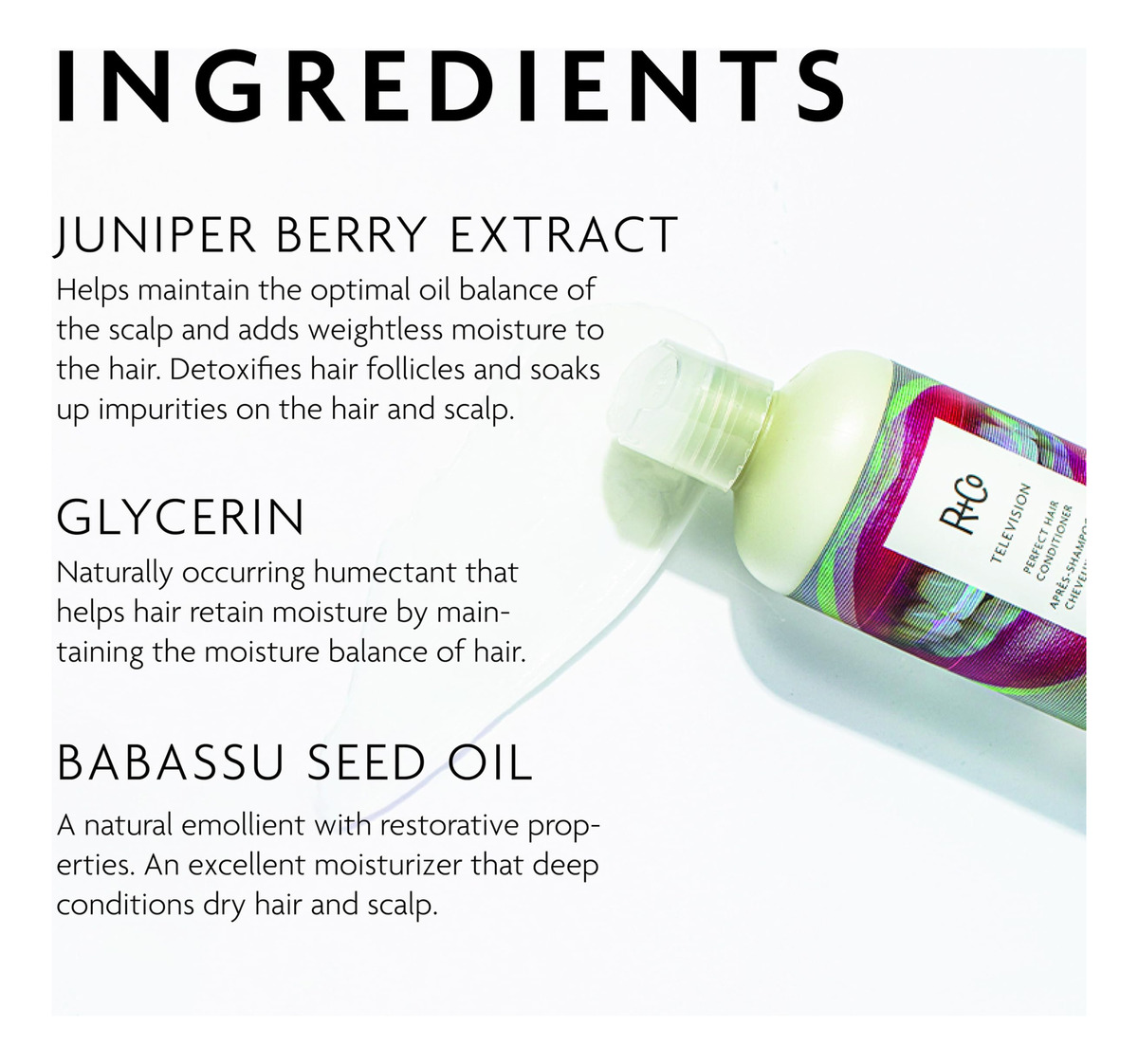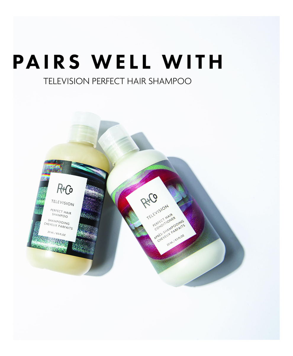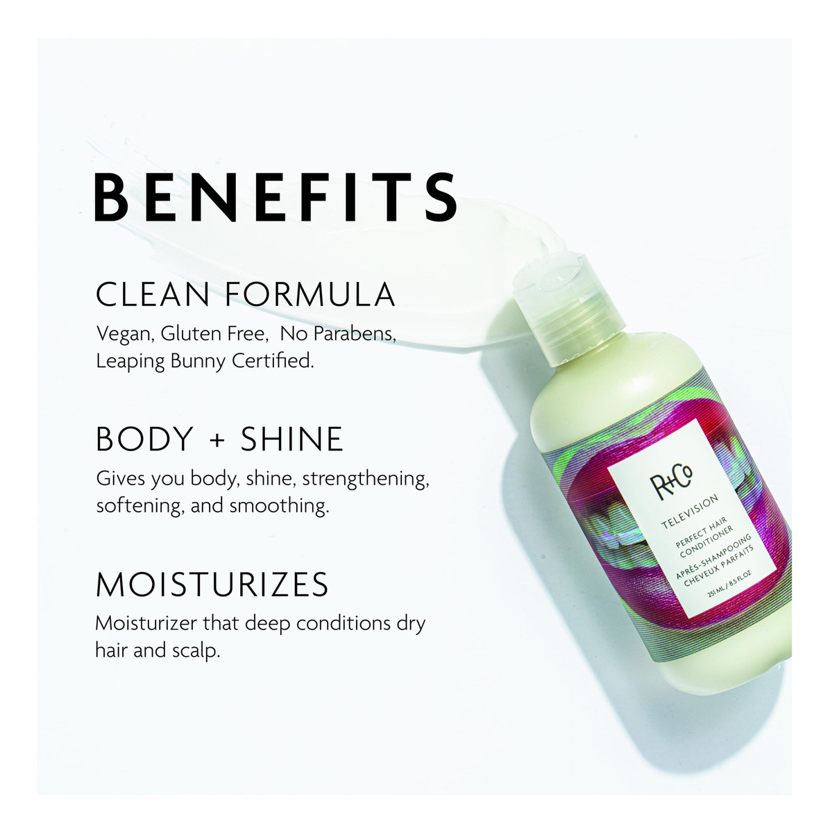 Condicionador de cabelo R+Co Television Perfect (8,5 onças) – Ajuda a manter o equilíbrio ideal de óleo do couro cabeludo e adiciona umidade leve ao cabelo. – Desintoxica os folículos capilares, remove impurezas, condiciona profundamente e adiciona brilho perceptível. – Protege o cabelo e o couro cabeludo dos agressores ambientais nocivos.