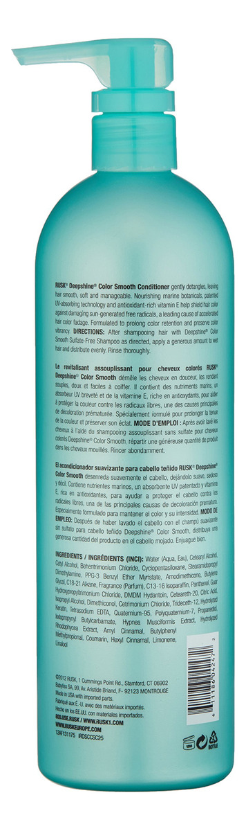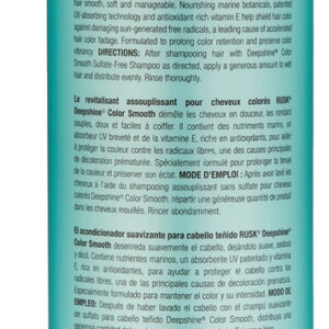 Condicionador RUSK Deepshine Color Smooth, 25 fl. oz. – Misturado com quaternium-95 e propanodiol para proteger o cabelo dos danos causados pelos raios UV – Oferece controle duradouro do frizz – O cabelo parece mais macio, mais elegante, mais brilhante e manejável com cores brilhantes – O condicionador Deepshine Color Smooth foi lançado pela casa de design Rusk – Condicionador de 25 onças – É recomendado para uso casual