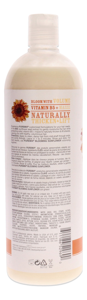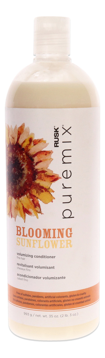 O condicionador de girassol RUSK PUREMIX Blooming é enriquecido com extrato de semente de girassol para hidratar suavemente o cabelo enquanto protege a cor, e com vitamina B5 Plus de milho para engrossar e levantar naturalmente os fios. Livre de sulfatos, parabenos, corantes artificiais.