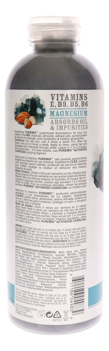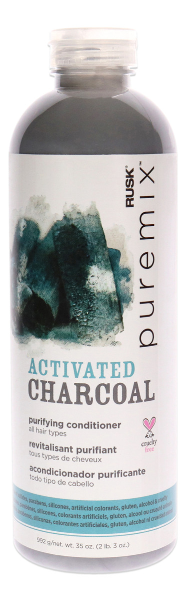 RUSK PUREMIX Activated Charcoal Purifying Conditioner for all hair types cleanses and purifies hair. Formulated with vitamins E, B3, B5, B6 and magnesium to absorb oil, dirt, and gunk from your hair strands without stripping away natural oils and refined oats for strength, quinoa proteins for color protection. Leaving you with healthy-looking hair.