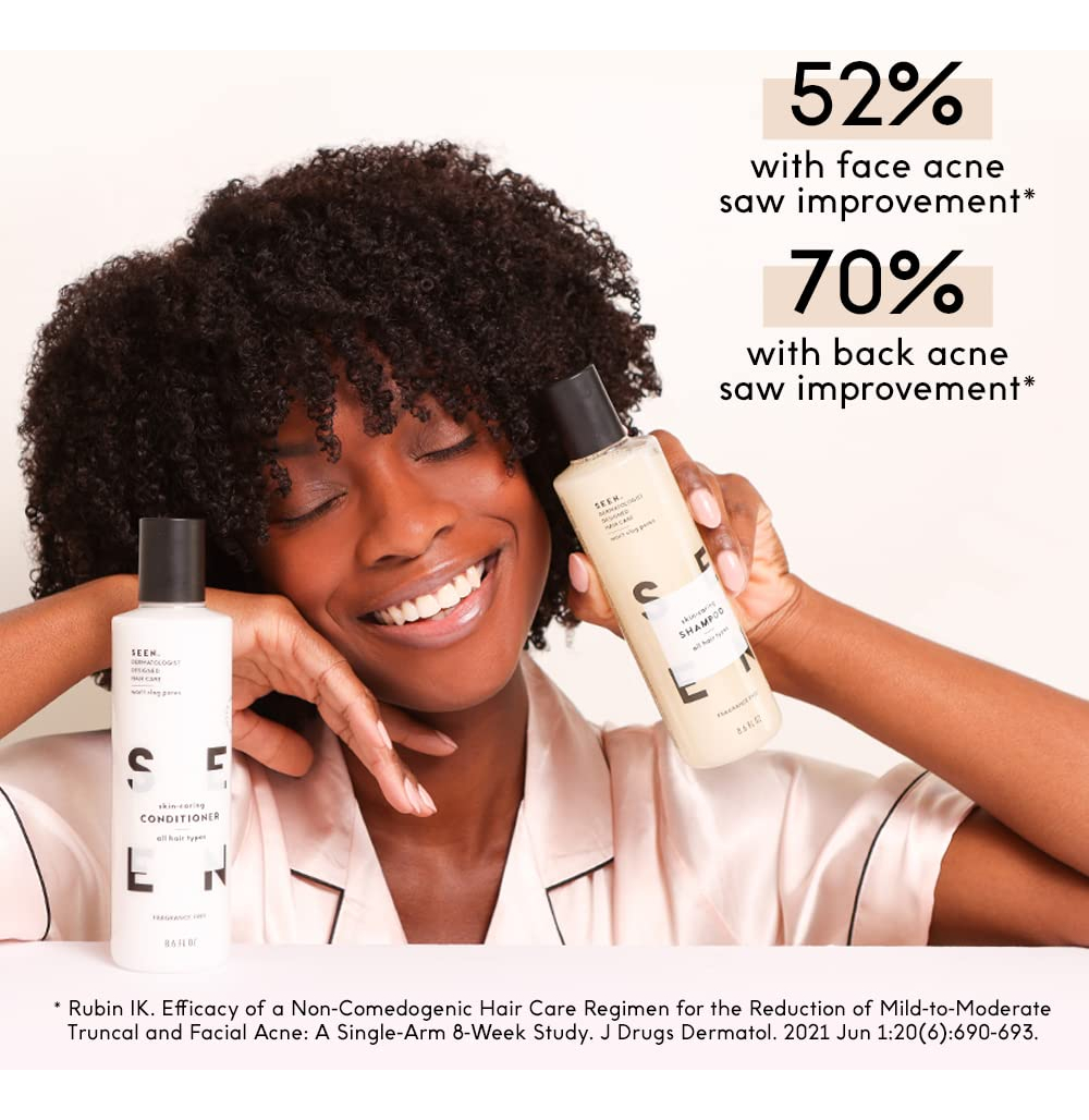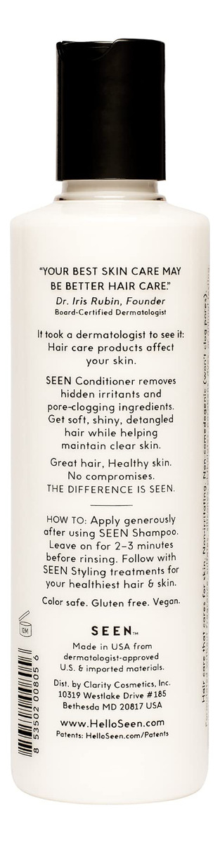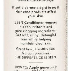 Desenvolvido por um dermatologista, esse condicionador leve para cabelos (e couro cabeludo) levemente secos, normais ou oleosos ajuda a desembaraçar, suavizar e melhorar o brilho, reduzindo o frizz e a quebra*. Formulado com ingredientes bons para o cabelo (e a pele), esse condicionador remove irritantes ocultos e óleos que obstruem os poros, além de ser seguro para todos os tipos de cabelo e pele, incluindo os tratados com cor e queratina. (Nota: Aqueles com cabelos muito secos ou danificados podem preferir nosso condicionador Deeper.) – O QUE É: Um condicionador desenvolvido por dermatologistas, sem fragrância, vegano e não comedogênico, que é suave, mas eficaz. O condicionador SEEN, sem perfume, não contém sulfato e ajuda a desembaraçar, suavizar e melhorar o brilho, ao mesmo tempo que reduz o frizz e a quebra. Este condicionador leve vegano e premiado é ideal para cabelos (e couro cabeludo) levemente secos, normais ou oleosos. Seguro para peles sensíveis. Seguro para peles com tendência a acne. Seguro para peles propensas a eczema. — Livre de: condicionador não comedogênico seguro para peles sensíveis e formulado sem fragrâncias, sulfatos, silicones, ftalatos, parabenos, corantes, óleos que obstruem os poros, conservantes liberadores de formaldeído, cocamidopropil betaína e glúten. Aprovado pela PETA e pelo Leaping Bunny. – BOM PARA: limpo e vegano. Condicionador sem sulfato que é bom para todos os tipos de pele e cabelo. Seguro para cores, seguro para queratina. Pode ser usado diariamente. Seguro para peles sensíveis. Seguro para eczema e pele propensa a acne. Reduz o frizz, suaviza o cabelo e dá brilho. – CLINICAMENTE COMPROVADO: condicionador sem perfume desenvolvido por dermatologistas que não é comedogênico (não obstrui os poros) e não é irritante. Seguro para peles sensíveis. Seguro para peles com tendência a acne. – O Fragrance Free SEEN foi formulado para ser verdadeiramente livre de fragrâncias. Não há óleos essenciais em nenhum produto SEEN, perfumado ou sem fragrância, e nossos produtos sem fragrância não têm fragrância ou fragrância mascaradora. Você pode notar que o produto tem um leve aroma que se origina dos ingredientes crus, mas essa não é uma fragrância adicional.