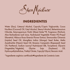 Water, Cetearyl Alcohol, Caprylic/Capric Triglyceride, Cocos Nucifera (Coconut) Oil, Cetyl Alcohol, Stearyl Alcohol, Behentrimonium Chloride, Butyrospermum Parkii (Shea) Butter* Water, Cetearyl Alcohol, Caprylic/Capric Triglyceride, Cocos Nucifera Oil (coconut), cetyl alcohol, stearyl alcohol, Behentrimonium chloride, Butyrospermum Parkii (shea) butter*, fragrance, Aloe Barbadensis leaf juice, hydrolyzed vegetable protein PG-Pr0pyl Silanetriol, Hibiscus Rosa-Sinensis flower extract, oil Simmondsia Chinensis (Jojoba) seed butter, Mangifera Indica (Mango) seed butter, Melia Azadirachta (Neem) seed oil, Brassica Campestris (Rapeseed) seed oil, panthenol, Sodium Lauroyl, hydrolyzed silk, tocopherol, glyce rin (vegetable), Glycine Soja (soy) oil, hydroxyethyl cellulose, triethyl citrate, caprylyl glycol, benzoic acid * Certified organic ingredient.