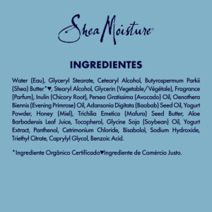 Water, Stearate, Cetearyl Alcohol, Butyrospermum Parkii (Shea) Butter* Water, Stearate, Cetearyl Alcohol, Butyrospermum Parkii (Shea) Butter*, Stearyl Alcohol, Fragrance, Inulin (Chicory Root ), Persea Gratissima (Avocado) Oil, Oenothera Biennis (Evening Primrose) Root Extract, Adansonia Digitata (Baobab) Seed Oil, Yogurt Powder, Honey, Trichilia Emetica (Mafura) Seed Butter, Coconut Leaf Juice Aloe Barbadensis, Tocopherol, Glycine Soja (Soybean) Oil, Yogurt Extract, Panthenol, Cetrimonium Chloride, Bisabolol, Sodium Hydroxide, Triethyl Citrate, Caprylyl Glycol, Benzoic Acid.