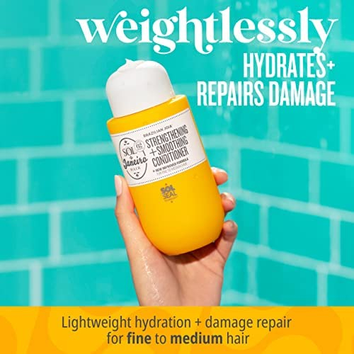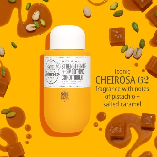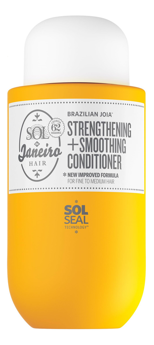 Condicionador fortalecedor e suavizante SOL DE JANEIRO Brazilian Joia (295 ml/10 oz.) — Um condicionador seguro de cor e reparador de pele que repara os danos, suaviza o frizz, aumenta o brilho e adiciona hidratação leve. Infundido com a fragrância Cheirosa 62 de caramelo salgado, pistache e baunilha. Formulado para cabelos finos a médios. – Principais benefícios: clinicamente comprovado que reduz os danos ao cabelo, protege o cabelo de danos futuros, combate o frizz e repara pontas duplas quando usado com o condicionador Brazilian Joia Strengthening + Smoothing (vendido separadamente). – Ingredientes principais: a tecnologia SOL Seal é nossa microcápsula vegetal que repara cabelos danificados e previne danos futuros em um único uso, como queratina, o óleo de castanha do Brasil é rico em selênio para nutrir, ajuda a proteger e restaurar o brilho vital, e a fruta Buriti está repleta de gorduras saudáveis para suavizar as cutículas e lutar crespe e fortaleça os cabelos secos e quebradiços. – Como usar: Limpe com o shampoo suavizante Joia Strengthening + (vendido separadamente) para obter o máximo de benefícios de hidratação e reparação de danos. Aplique o condicionador do meio às pontas. Deixe agir por dois a três minutos antes de enxaguar bem. Continue com o condicionador Leave-in Joia Milky do Brasil (vendido separadamente) antes de modelar para desembaraçar, combater o frizz, hidratar e proteger contra o calor. – Adicional: Nossa fórmula é vegana certificada pela PETA e livre de crueldade, sem cor, sem sulfato e sem silicone. A fórmula é boa para cabelos tingidos, cabelos danificados, cabelos finos, cabelos médios e amantes do perfume Bum Bum Cheirosa 62 brasileiros.