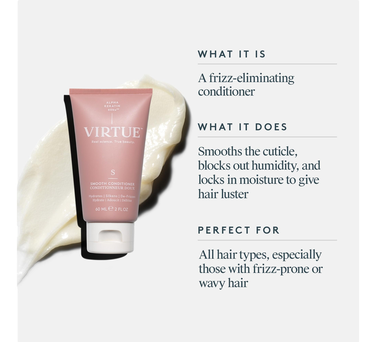 O condicionador Virtue Smooth elimina o frizz a cada banho. Ele acalma a cutícula, retém a umidade e retém a umidade, dando ao cabelo um brilho brilhante. – Formulado com nossa proteína Alpha Keratin 60ku, a dupla Virtue Smooth Shampoo & Smooth Conditioner atua como um poderoso tratamento diário de suavização para cabelos no chuveiro. Eles repavimentam cutículas ásperas e reduzem o atrito entre cada mecha. Combater o frizz na origem do cuidado do cabelo vai anos-luz além da limpeza básica. – O QUE É: Um condicionador rico em umidade que adiciona deslizamento e hidratação ao enxaguar. – Fragrância: uma mistura restauradora de ervas, frutas e frutas cítricas, incorporando óleos essenciais calmantes de lavanda e menta fresca. – Para todos os tipos de cabelo, especialmente aqueles com cabelos crespos, ondulados ou encaracolados. Seguro para cabelos tingidos e quimicamente tratados. – Livre de sulfatos, parabenos, ftalatos, cores e corantes sintéticos. Sem glúten. Livre de crueldade.