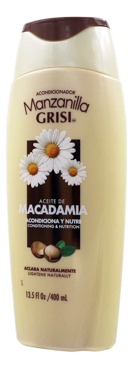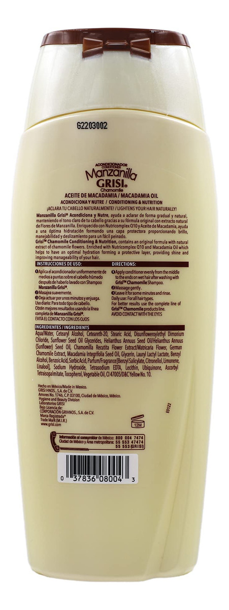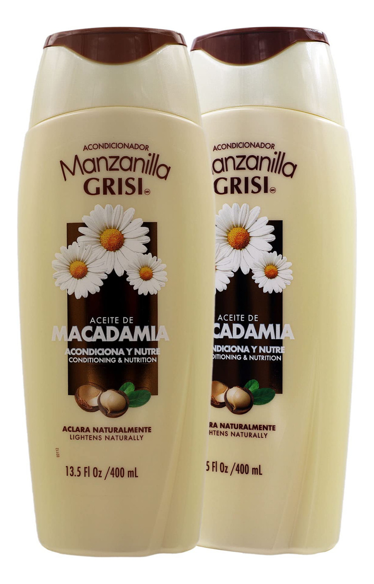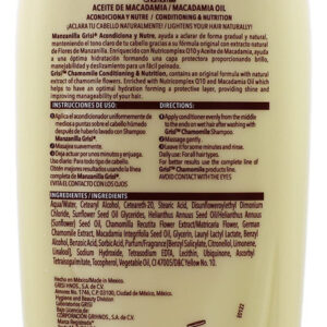 Condicionador Manzanilla (Camomila) 13,5 onças da Grisi – O condicionador de camomila Grisi é um produto ideal para clarear o cabelo devido à sua fórmula enriquecida com camomila. Isso o ajudará a clarear naturalmente seu cabelo, adicionando brilho e mechas douradas sem danificá-lo. – Nosso condicionador enriquecido com extrato de camomila ajudará você a ter cabelos mais macios, brilhantes e cheios, proporcionando sedosidade e força ao cabelo – Nossa fórmula é enriquecida com Nutricomplex Q10 que hidrata e nutre seu cabelo da raiz às pontas; será sedoso e fácil de pentear. Cuidados com o cabelo nunca foram tão fácil, e você pode clareá-lo enquanto se mantém saudável e radiante. – Ele fornece nutrição intensa ao cabelo, deixando-o brilhante e luminoso. O pigmento amarelo nas flores de camomila adiciona brilho radiante ao cabelo, protegendo-o dos danos ambientais. – Condiciona e nutre, proporciona maciez, fortalece e revitaliza o cabelo. Nosso condicionador o ajudará a reativar a produção de queratinas ausentes, melhorando o volume e a flexibilidade do cabelo.