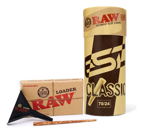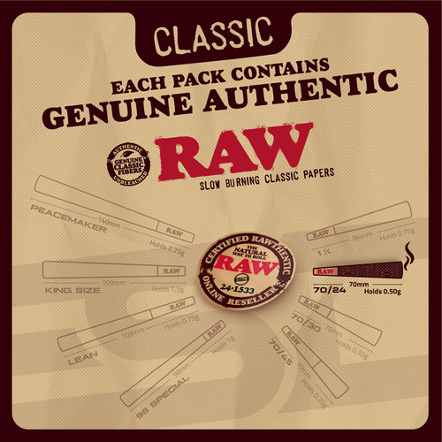 Os papéis clássicos da série RAW Classic consistem em fibras naturais para fornecer papéis de alta qualidade, não branqueados e de queima naturalmente lenta. Esses cones RAW economizam seu tempo porque eles vêm pré-enrolados para que você tenha a experiência completa sem precisar perder tempo rolando. Eles são perfeitos para pessoas que acham difícil enrolar manualmente, bem como para rolos experientes que gostam de otimizar seu tempo. Eles são a maior conveniência de enrolar, pois você só precisa enchê-los com o que quiser para fumar, torcer até a ponta e iluminar a marca d'água. Cada papel tem marca d'água com a marca d'água patenteada Criss Cross da RAW. Essa marca d'água especial ajuda a evitar rasgos e mantém as características suaves de queima uniforme pelas quais o RAW é famoso. Os RAW Classics têm uma cor marrom claro natural translúcida e são tão finos que quase dá para ver através deles, por isso a marca d'água é importante. O design exclusivo em forma de cone promove uma queima uniforme no início e, em seguida, é necessária cada vez menos intensidade com cada sopro. Isso significa que seu primeiro sopro será tão forte e eficiente quanto os papéis rolantes LastQuality Raw, sem adição de giz ou corantes, ao contrário das marcas concorrentes. Os cones RAW usam uma goma à base de água que leva muito tempo para secar. Quando os cones RAW são enrolados, eles precisam descansar por 24 horas antes de serem empilhados e embalados, o que resulta em uma produção muito lenta. Outras marcas usam acetato de etil vinil puro (cola química), que não é orgânico, sua cola seca quase instantaneamente para que possam produzir seus cones de forma muito mais rápida e barata. Os produtos da RAW são focados na qualidade e em experiências memoráveis. Nota: Todos os cones RAW são enrolados à mão e, dependendo da tonalidade da folha usada, a visibilidade da marca d'água varia – Rawthentic | Cones 100% autênticos da RAW e reembalados pela ESD para proporcionar uma experiência aprimorada – A opção mais ecológica – Os cones clássicos da RAW são ecológicos, de queima lenta, feitos de recursos RAW – Queima lenta | Cones com marca d'água com a marca cruzada proprietária da RAW que Ajuda a evitar corridas — Queimação naturalmente lenta | Feito de fibras não branqueadas com uma linha de goma natural, sem adição Giz ou corantes! – O que você ganha | 50 cones clássicos de tamanho 70/24 que vêm com palitos de embalagem e um carregador de cone RAW